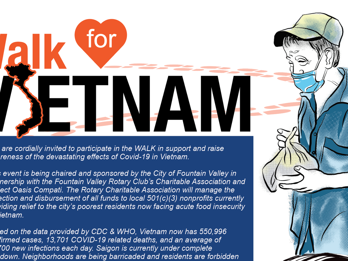 Want to join us in making a difference for the people most in need in Vietnam? The City of Fountain Valley is holding a Walk-a-thon to raise money, through the Fountain Valley Rotary Charitable Association, to be used to help the people suffering in Vietnam due to the COVID-19 virus and related restrictions in their country, and any donation will help make an impact. Thanks in advance for your contribution to this cause that means so much to all of us.