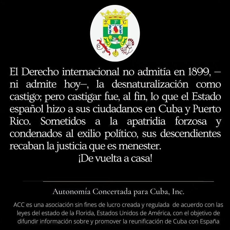 Desde el advenimiento del régimen democrático, España ha venido sistemáticamente enfrentándose a su pasado con una ejemplar gallardía, al resarcir importantes deudas históricas en los descendientes de aquellos que fueron preteridos, verbigracia, los judíos sefardíes o los emigrados por la guerra civil; pero nadie habla de los casos de Cuba y Puerto Rico, cuyos naturales, españoles de origen por ley y por tradición, fueron despojados arbitrariamente de la nacionalidad que durante 4 siglos ostentó su estirpe.