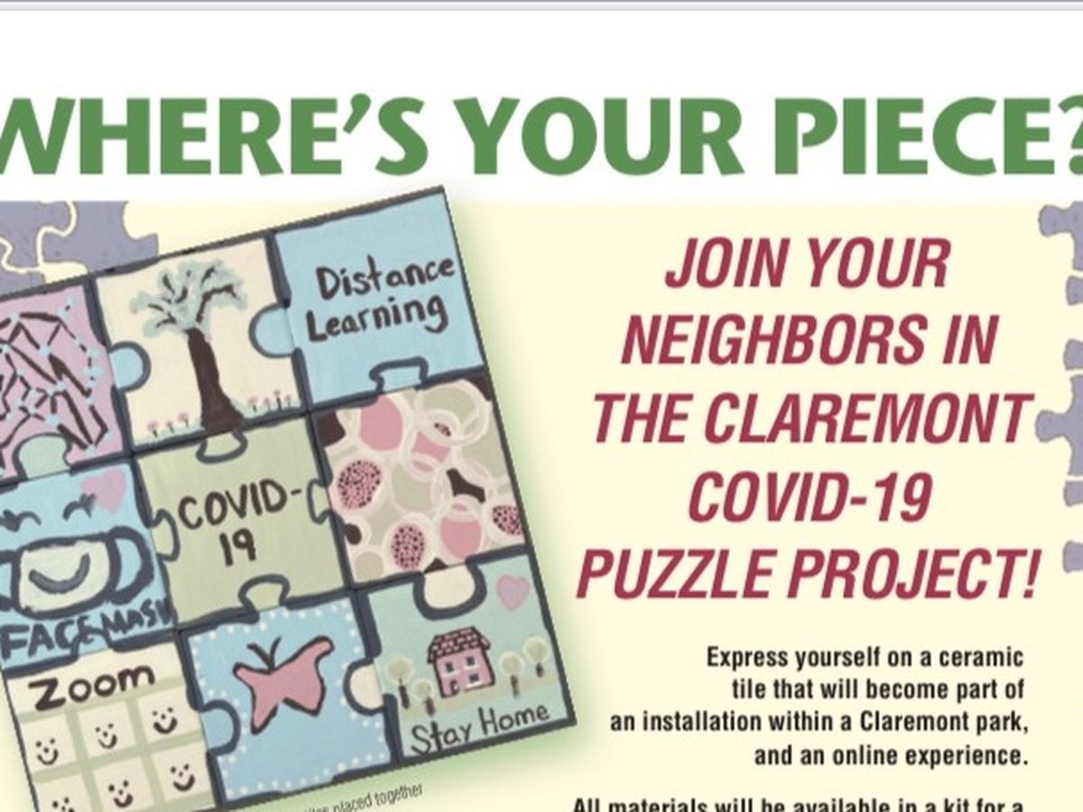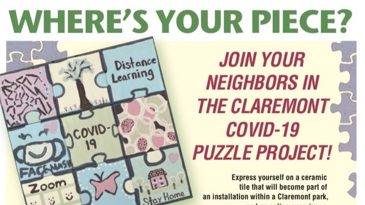 The Claremont Public Art Committee has partnered with several local groups on a project to create a lasting, community piece of art to represent the COVID-19 Pandemic. It will become a collective expression of thought and experiences for future generations to not only see but to be a part of. People of all ages will help create a piece of a puzzle. The individual or family will decorate a piece of a puzzle using words, pictures, drawings, and color representing how they have felt during the pandemic. Words of gratitude to essential workers, a thank you to our educators, our parents, our children; call it a reflection piece. The individual puzzle pieces will be collected, glazed, sealed, and grouped together to form a display. The installation might be given the ability to grow over time, much like ourselves.