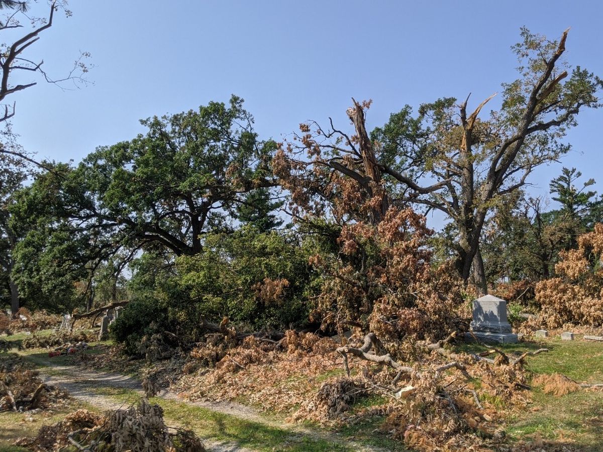 Iowa’s strongest recorded derecho storm hit the city of Cedar Rapids on August 10th with powerful peak wind speeds reaching over 100 mph. The resulting damage left Oak Hill Cemetery in a scene of emotional and tragic disarray. Throughout the storm over 154 trees across Oak Hill’s 34 acres of land were severely damaged, 2/3 of which are either fully or mostly swept to the ground. Many of these trees landed on, knocked over, or shattered headstones, some of which are nearly two hundred years old.