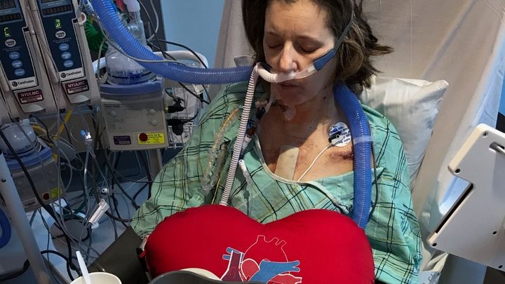 Tracy, previously having been an avid athlete, had lost considerable weight and muscle mass and had become frighteningly thin and frail.  While in the hospital, her heart became unable to pump enough blood on its own to keep Tracy alive. Tracy underwent a procedure that inserted an assistive device called an “balloon pump” into her leg and left her connected to machines to work the device on a 24 hour basis. The balloon pump left her completely bedridden. This is how she would remain until her transplant.