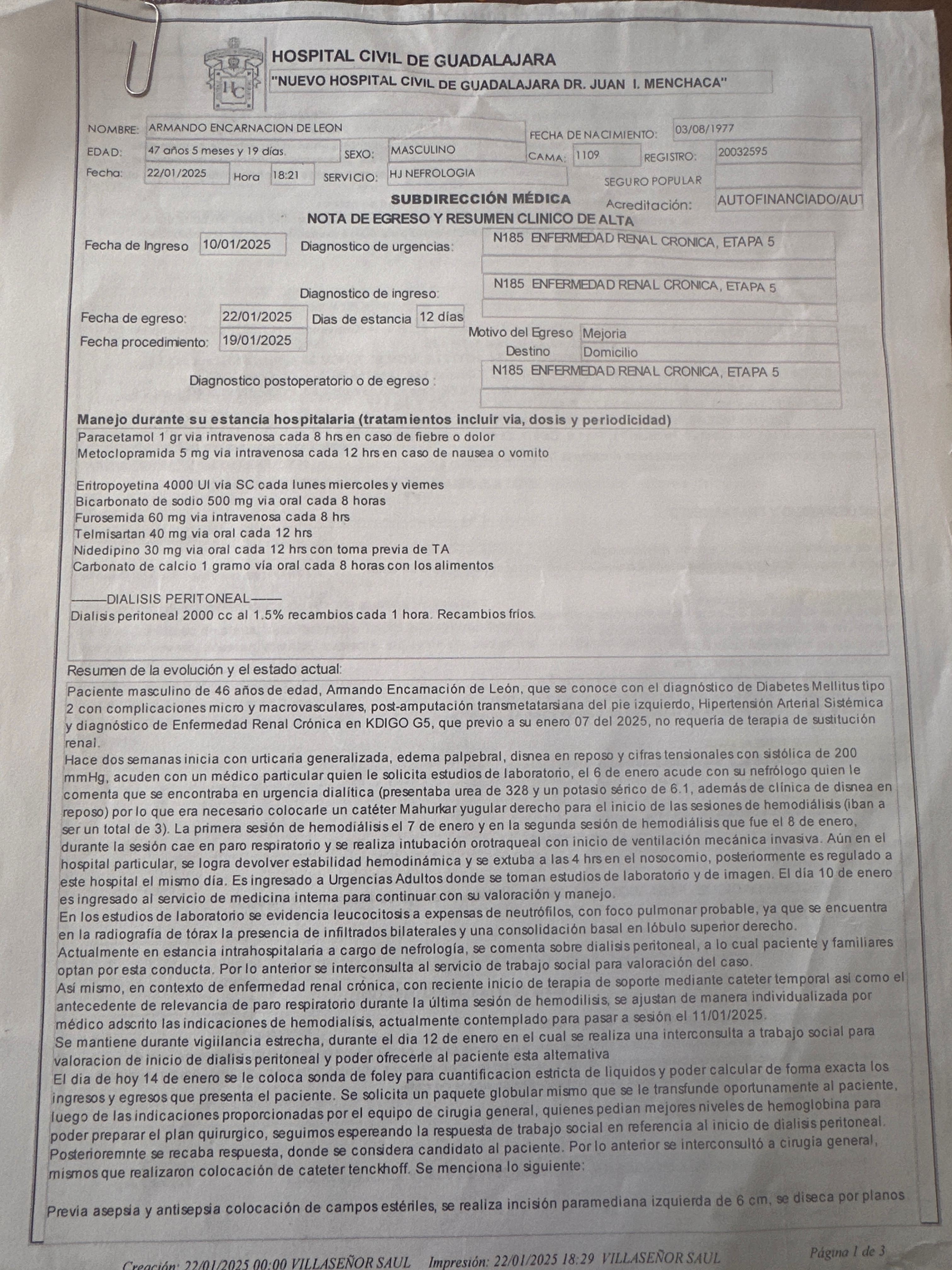 Les platico en enero de este año inicio con tratamiento sustitutivo de hemodiálisis y entró en paro cardio respiratorio por lo cual estuve entubado , posterior a la extubacion estuve en terapia intensiva , mi diagnóstico insuficiencia renal en etapa terminal , mas otras complicaciones que se fueron dando ya hospitalizado , siendo sincero no tenía un buen pronóstico , pero gracias a Dios después de 61 días hospitalizado , aquí sigo luchando .