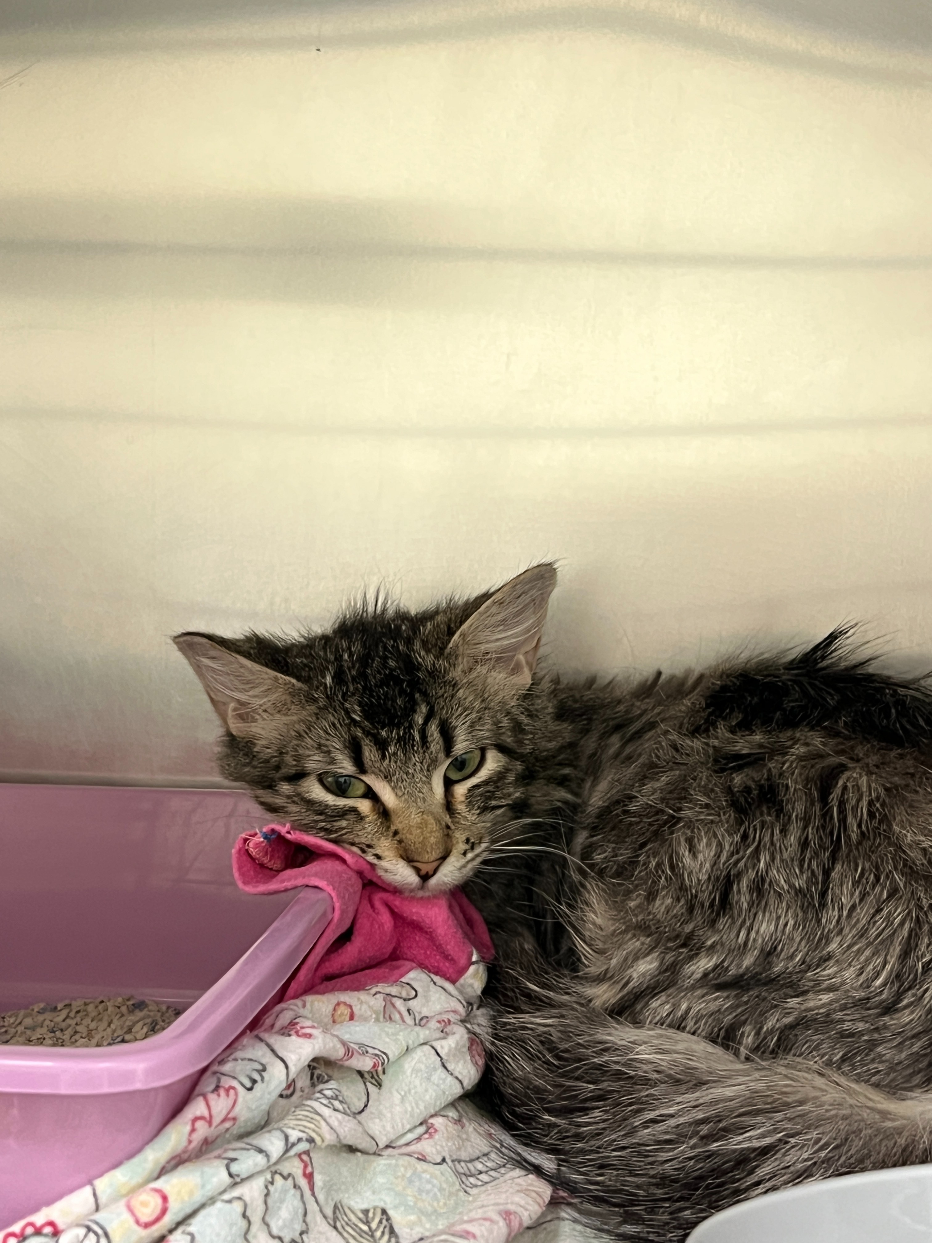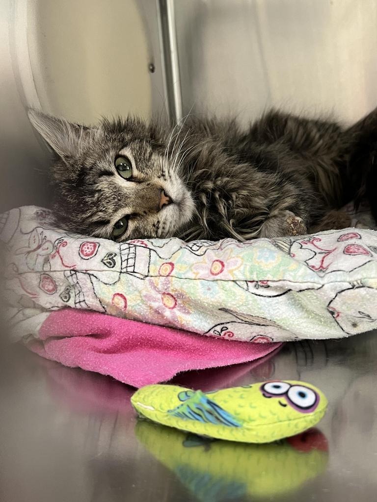 Colette came to us with her brother on March 12th, 2025. When we took her in, we were told both of them were found on the street and had been hit with rocks and bb guns by children in the neighborhood. We weren't going to let that stop us from saving them. When they came in, they were both terrified. We couldn't give them food without them hissing and wincing. Colette's leg was broken, with wounds filled with debris and dirt. We ran bloodwork on Colette, as she had stop eating, come to find out she was severely anemic. The doctors suspected negative outcomes, as she was very sick. After rounds of medication, a lot of food and a lot of love, we got great news - her bloodwork is completely normal! However, she still needs her amputation.