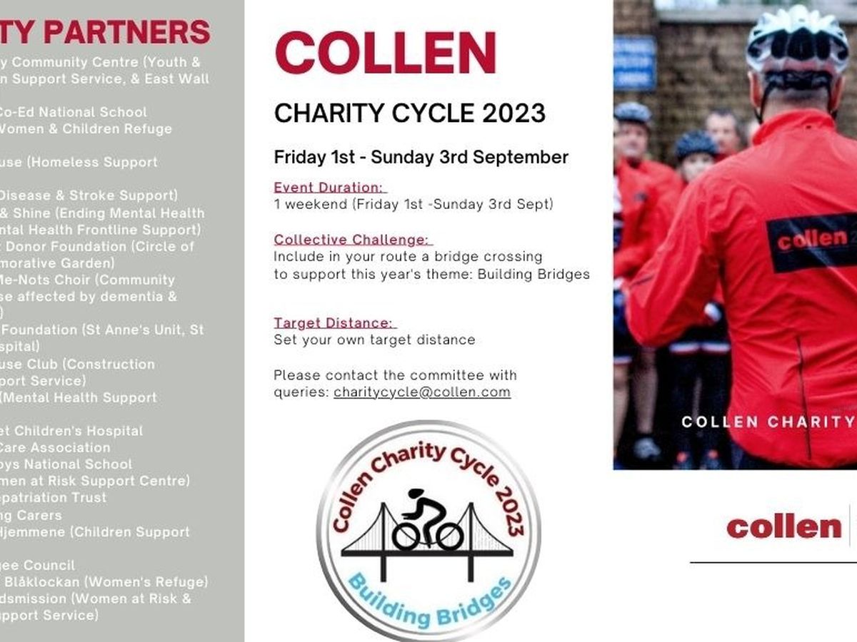 Collen Charity Cycle 2023: ‘Building Bridges’, will bring Collen teams in Ireland, the UK, Denmark and Sweden together as a cycle across bridges to promote and fundraise for several charities across the regions in which Collen operates. This year the aim is to encourage as many people as possible to join the Collen Charity Cycle team in spreading the message of connection and unity as a bridge of support within our communities. Participants are invited to cross or pass by a bridge as part of their cycle route, to show support for this year’s theme ‘Building Bridges’ and help raise awareness of the services provided by our 22 charity partners in our local communities. Over the course of one weekend, Collen employees, friends, family, clients, subcontractors, and extended supply chain will participate in the event with no limitations and enjoy the experience at their leisure, choosing their route and cycling at their own pace. Whether participants cycle 10km or 300km, everyone’s distance matters so this event will appeal to all fitness levels, from beginner to advanced cyclists.