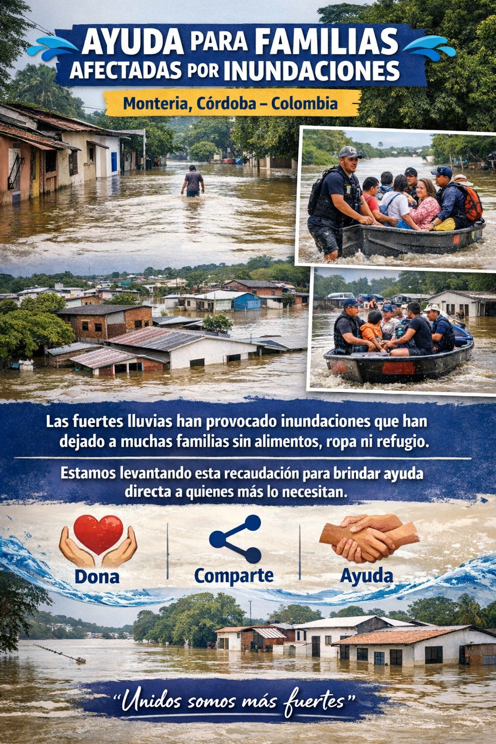 HOY QUEREMOS COMPARTIR CON USTEDES ESTA GRAN TRAGEDIA QUE AZOTA NO SOLO A UNA FAMILIA, SINO A TODO UN DEPARTAMENTO Y PAÍS( MONTERÍA-CÓRDOBA. COLOMBIA). CREEMOS QUE CADA APORTE POR MUY POCO QUE SEA, SERÁ DE GRAN BENDICIÓN Y LLEGARÁ A LAS PERSONAS INDICADAS.ELLOS HAN PÉRDIDO LO POCO QUE TENÍAN, SE QUEDARON SIN NADA DEBIDO A ESTA GRAN INUNDACIÓN. AYUDAMOS CON TU APORTE Y COMPARTIENDO ESTE ENLACE, PARA QUE OTROS PUEDAN AYUDAR Y LLEGAR A META PROPUESTA. DIOS LES BENDIGA Y MUCHAS GRACIAS.