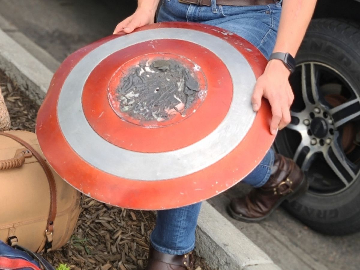 Yesterday, someone broke into that vehicle and stole the Captain America suit and shield. He was able to recover some of these pieces, but they are badly torn up. The helmet is destroyed and the gloves are gone.