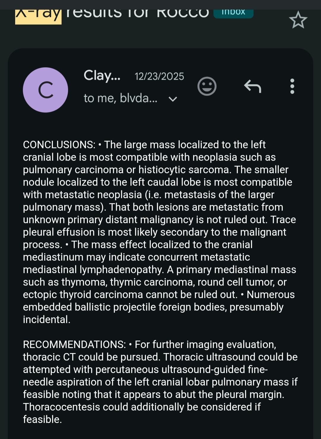 Over the holidays, we rushed Rocco to the ER vet after he began coughing and struggling to breathe. Imaging and testing shows advanced lung cancer, including a large mass in his lung, signs of spread and fluid buildup in his chest cavity. After many difficult conversations, we made the heartbreaking decision not to pursue aggressive cancer treatment. Given Rocco's age and how advanced the cancer is, treatment would not offer a cure and could take away from his quality of life. Our focus now is on palliative care - managing his breathing and giving him as much love and comfort as possible for the time he has left.