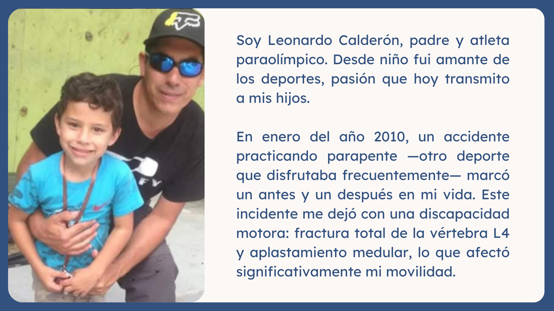 Hola, soy Leonardo Calderón, padre y atleta paraolímpico. Desde niño fui amante de los deportes, pasión que hoy transmito a mis hijos.