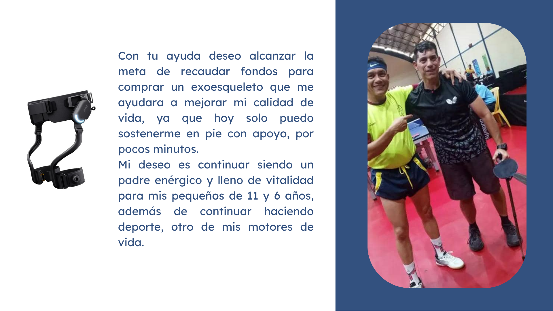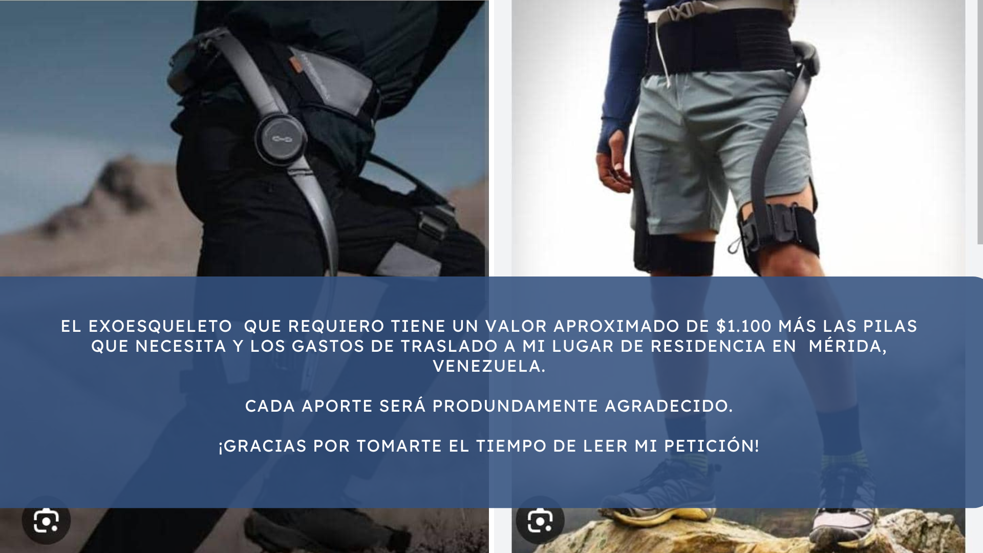 Esta petición que realizo por este medio tiene el fin de recaudar fondos para comprar un exoesqueleto que me permitirá seguir en pie, ya que hoy es una dificultad sostenerme sin apoyo y caminar por más de unos minutos.