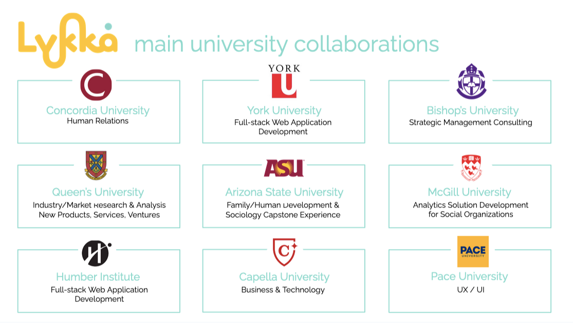 - We have garnered many extremely valuable collaborations with universities across North America with whom we are coding our platform, as well as further refining many key aspects of our mission (see some of them on the image below)