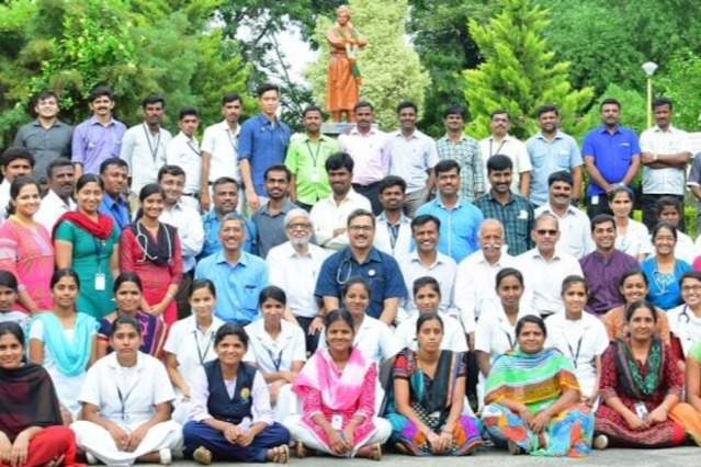 Pictured above: Vivekananda Memorial Hospital (VMH) in Saragur. Pictured below: Healthcare workers at VMH.