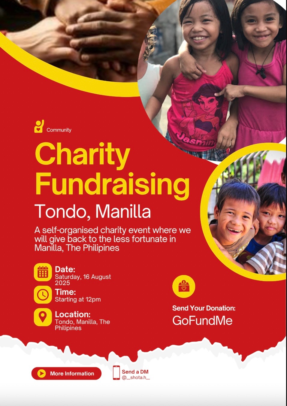 Hii, my name is Shota and I am a 23 years old student currently based in Amsterdam, The Netherlands. In a few days (from August 14), I will be travelling to The Philippines for two weeks. Upon doing research about the country, I found out that it has a huge poverty rate and that just in Manila, about 35% of the population lives in slums. Imagining that there are so many men, women, and kids underfed and have to live in these conditions, with no fault of their own moved me to take action.
