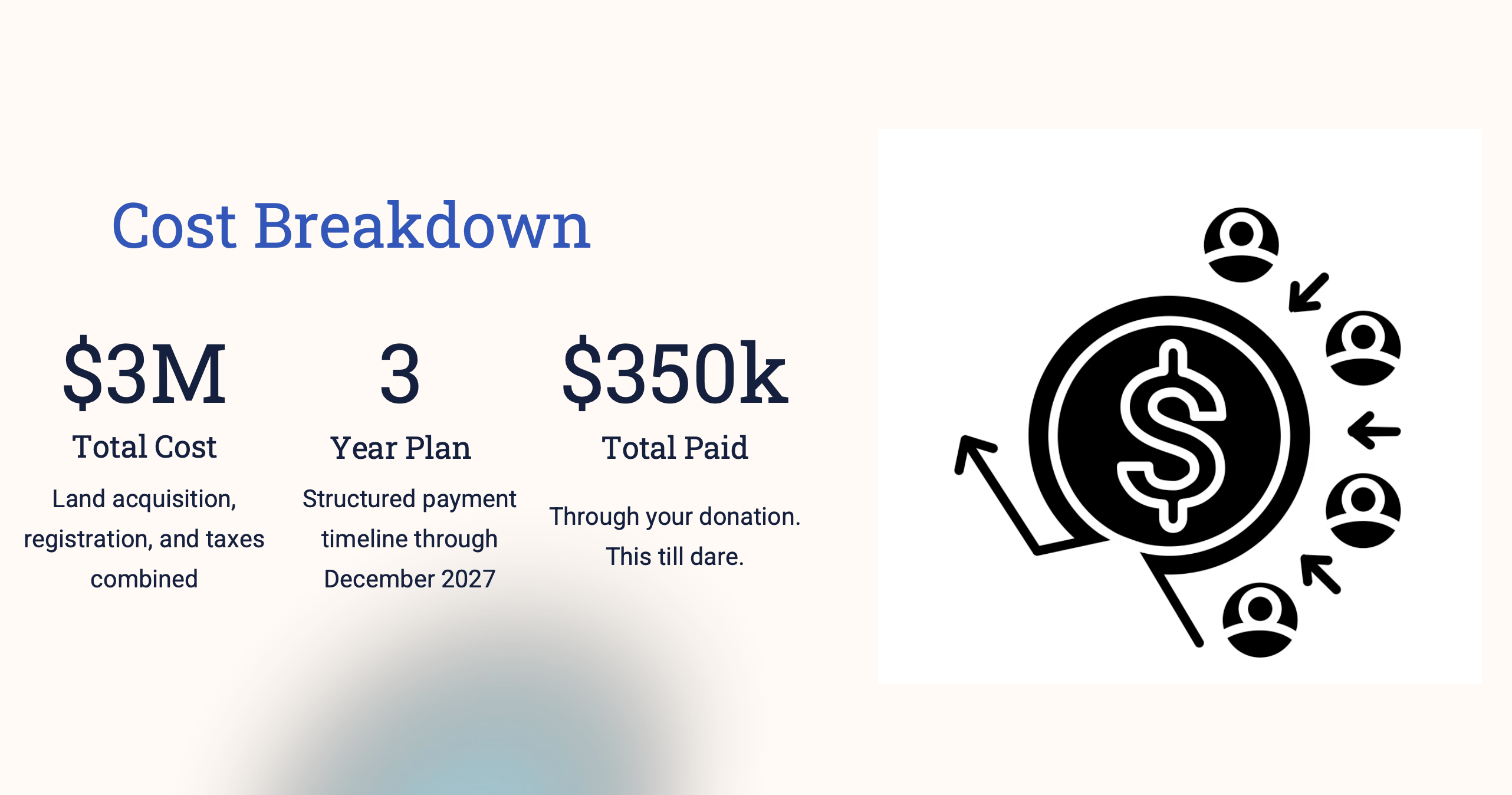 The total cost of the project, including land acquisition, registration, and taxes, is $3,000,000 CAD. We are working with a structured 3-year payment plan through December 2027.