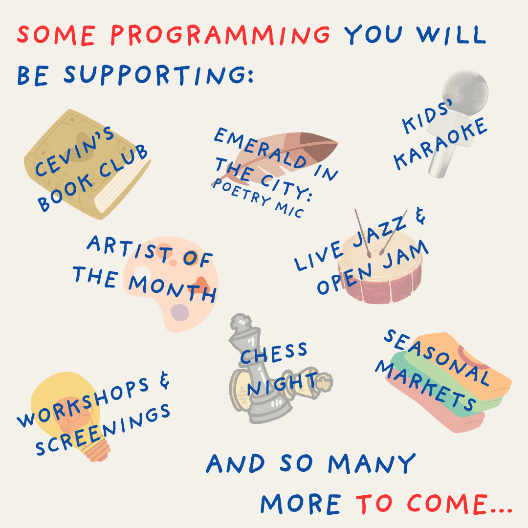 Through hosting free and low-cost cultural programming, open mics, fundraisers, community meetings, DAILY PRESS seeks to provide consistent employment for local residents. For many in the neighborhood, we are one of the few accessible spaces to meet, organize, and simply exist.