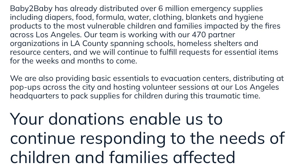 Hi everyone! We are raising donations for Baby2Baby, a nonprofit providing essential items like diapers, formula, and clothing to families in need—especially those impacted by the recent LA wildfires. Your donation will go directly to families who need it most.