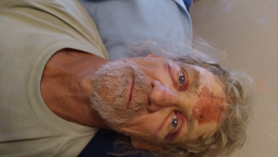 He was shingling a very steep roof for a relative. This was a free job. The nails holding the brace for the roof steps pulled out of the 100-year-old rotting 2 x 4's. He fell 20 feet to the ground and landed face-first on a concrete sidewalk. He was knocked out and came to after a few minutes. He was taken to the emergency room. He has a shattered knee, fractured ankle, sprained wrist and many lacerations on his face, arms and legs.