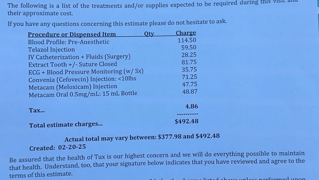 Hello! This is Tux! Tux was previously a stray cat who I had been trying to catch for a year. Three weeks ago, Tux allowed me to pick him up, and I was finally able to get him to a vet. Tux was drooling and severely matted, which started my initial concern for him. He recently got a wellness exam, got neutered, got vaccinated, and got a bath and full shave. Tux was finally seen by a vet about the drooling, and he is missing his upper canine, which broke off into his gums and has his entire right side of his gum extremely red and swollen. The vet said that Tux is definitely in pain and that the surgery he needs is urgent and crucial for the restoration of his health. Tux’s journey is on TikTok @tuxtuxthetuxedo.