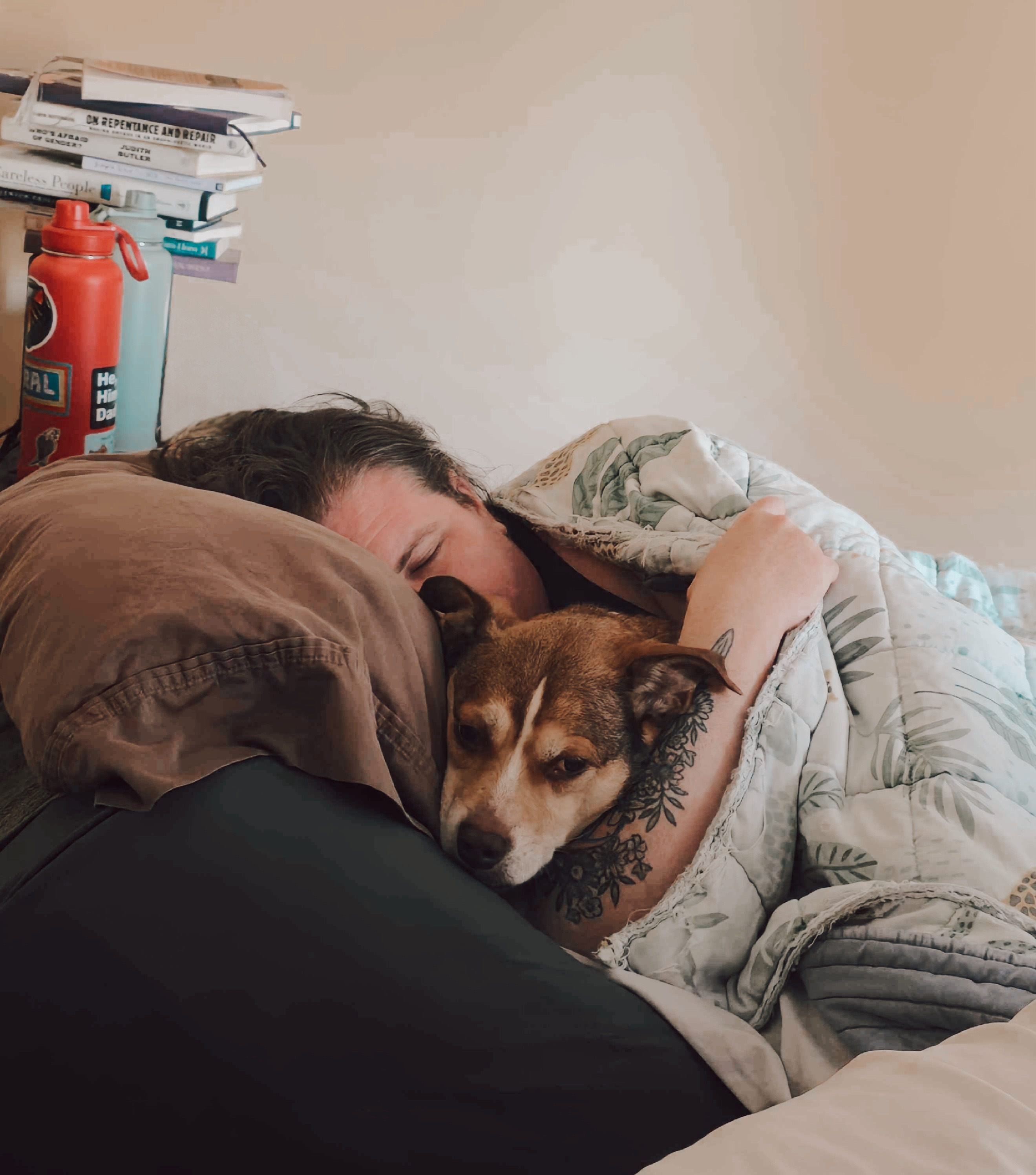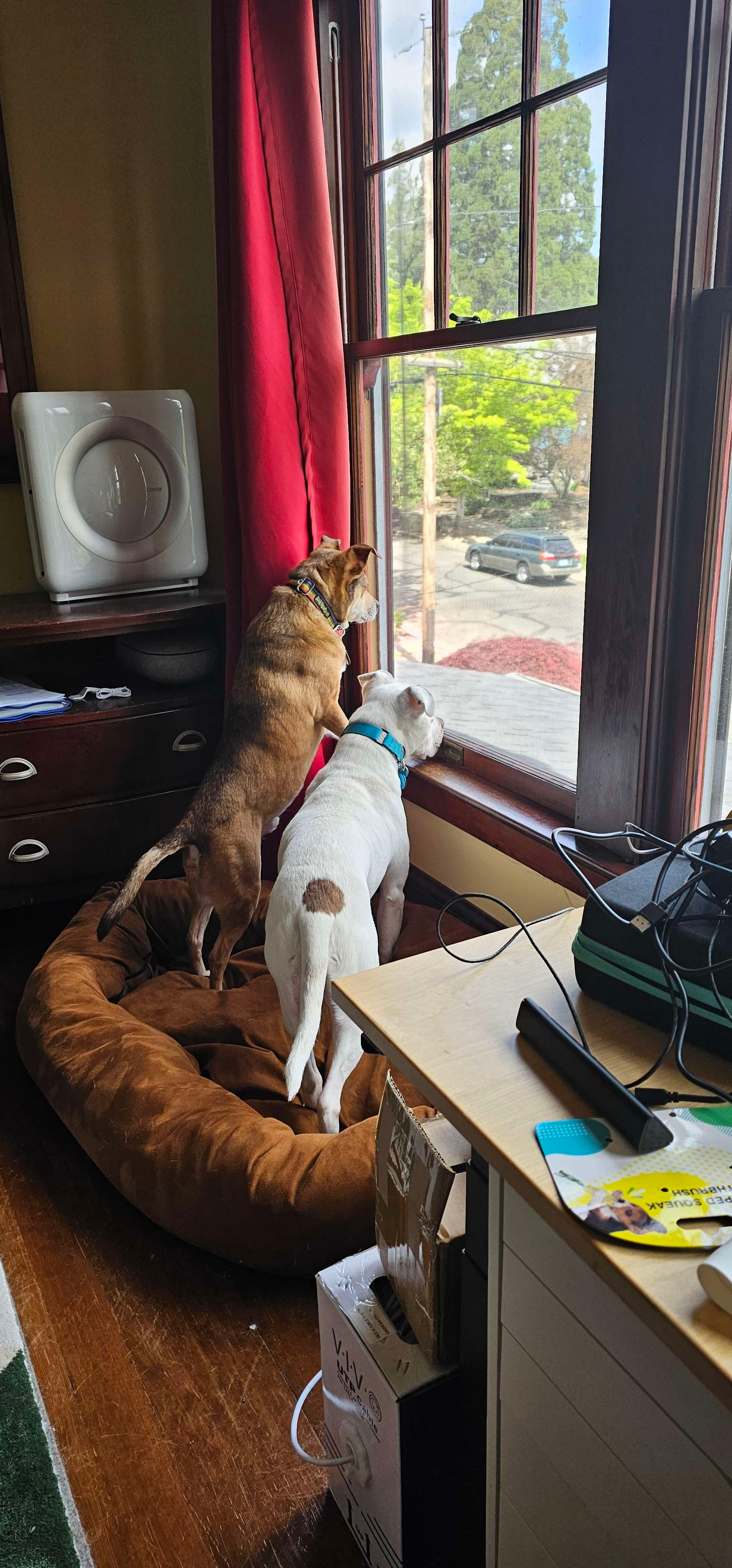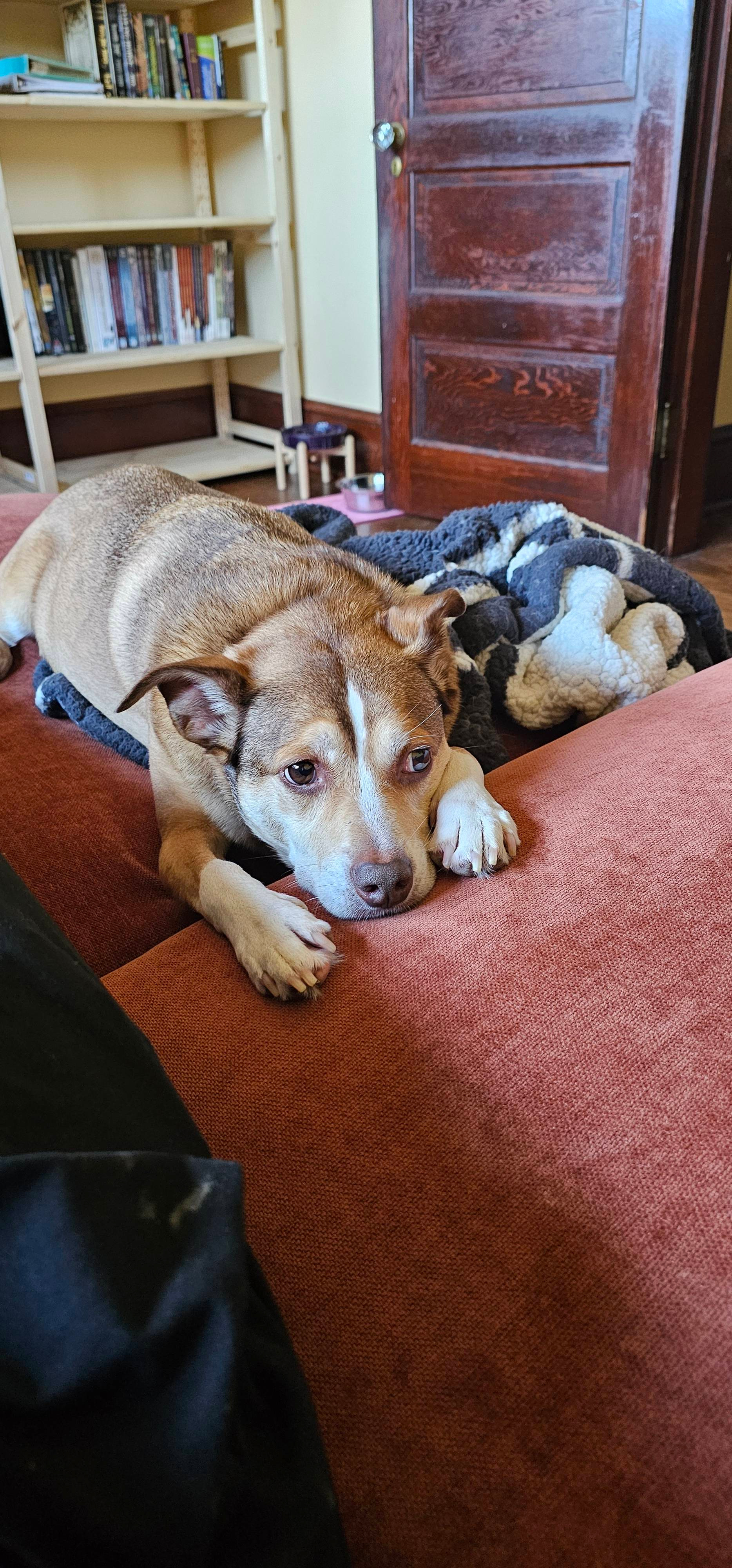 No joke: our kitchen trash is behind a steel baby gate, in a locking trash can with bricks in the bottom, because he's clever and fast and when all else fails, he learned to body-slam the trash can to knock it over. We've finally gotten things set up so he (hopefully, omg) won't get into the garbage anymore, but he's been losing weight and apparently having quite a bit of discomfort for weeks now. At first we thought his back was hurting him bc he was prayer-posing (big stretch!) & didn't want to eat from a bowl on the floor, but a raised feeder seemed to fix the issue. Once we realized there was An Issue and thought we had a theory on what was wrong, we took him to the vet.