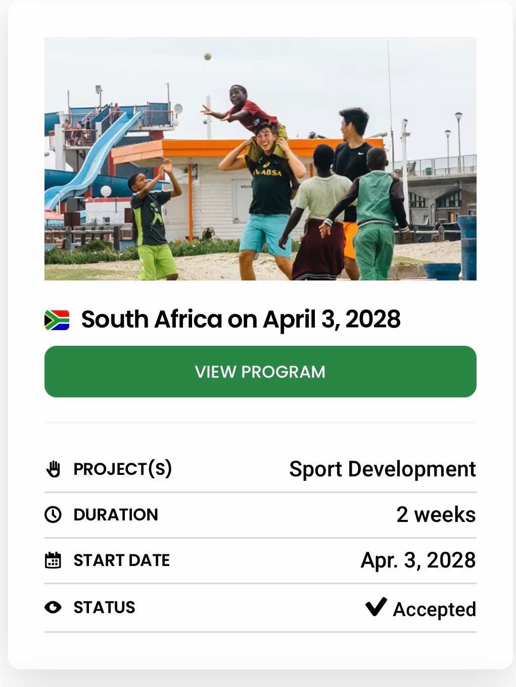 The IVHQ opportunity consists of myself flying over to cape town - South Africa, as a part of a sporting development project, designed to help the children of South Africa to be open to the endless opportunity that sport brings. The prices are a $389 initial sign up fee alongside a rough $400 program fee. This does not include however the flights to South Africa, hence my ask for your help.