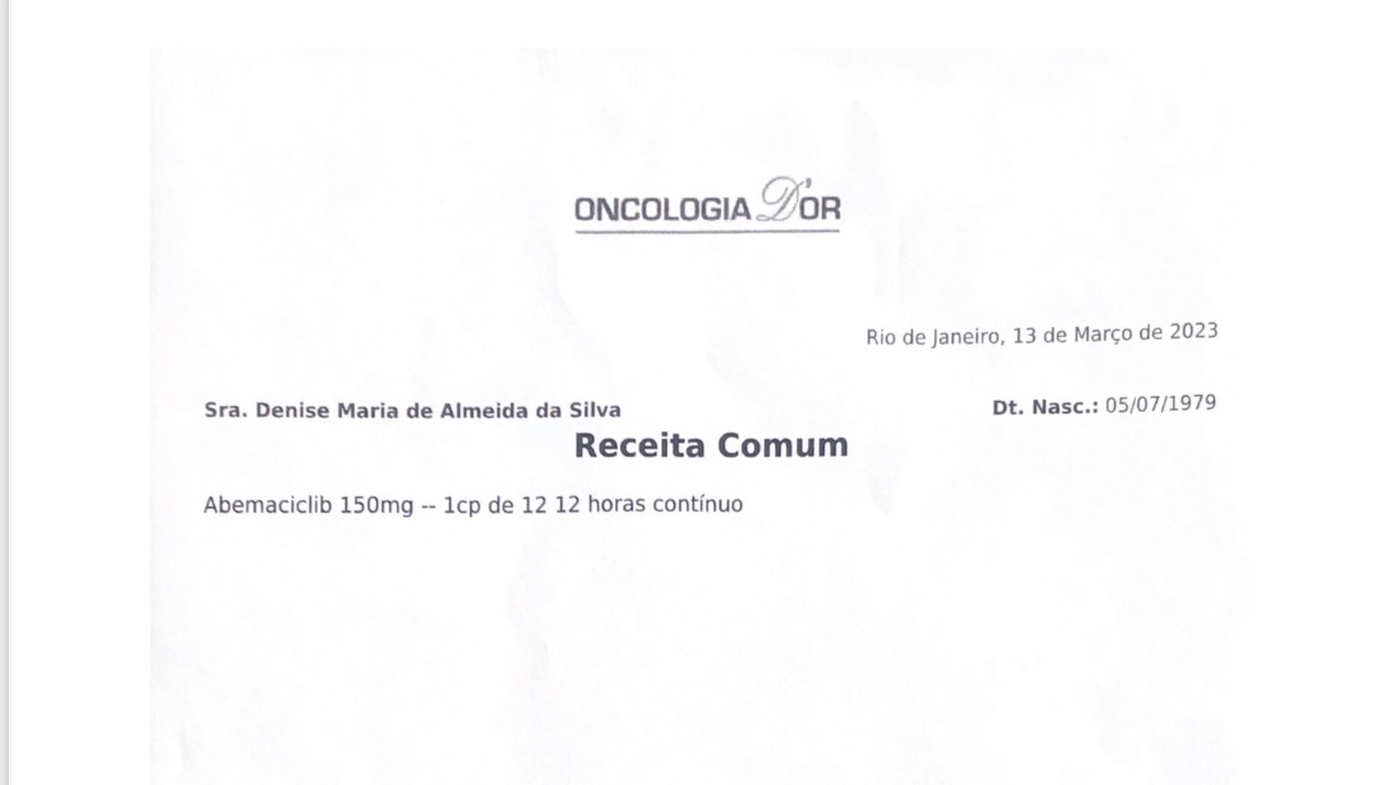 Ela se chama Denise Maria de Almeida, tem 44 anos, eh casada e tenho 2 filhos. Em 2020 foi diagnóstica com Ca de mama fez Quimioterapia, mastectomia com reconstrução com expansor. Logo após também fez radioterapia. Estava em acompanhamento com hormônio terapia. Mas depois de 1 ano após idas e vindas no hospital foi diagnóstica com metástase nos ossos e no fígado. Faz tratamento no Inca no qual lhe disponibiliza remédios padrão. Mas para melhor tratamento precisa fazer uso de um remédio chamado Abemaciclib o mesmo por lei já deveria estar sendo disponibilizado pelo Sus , mas não está. Então entramos com um processo pela justiça no mês de março . Em agosto saiu a decisão favorável, mas eles recorreram e não podemos mais esperar. Necessitamos desse remédio para ter um controle da doença e ter uma qualidade de vida melhor. Infelizmente nós da família não temos condições de arcar com a medicação que tem um custo altíssimo.