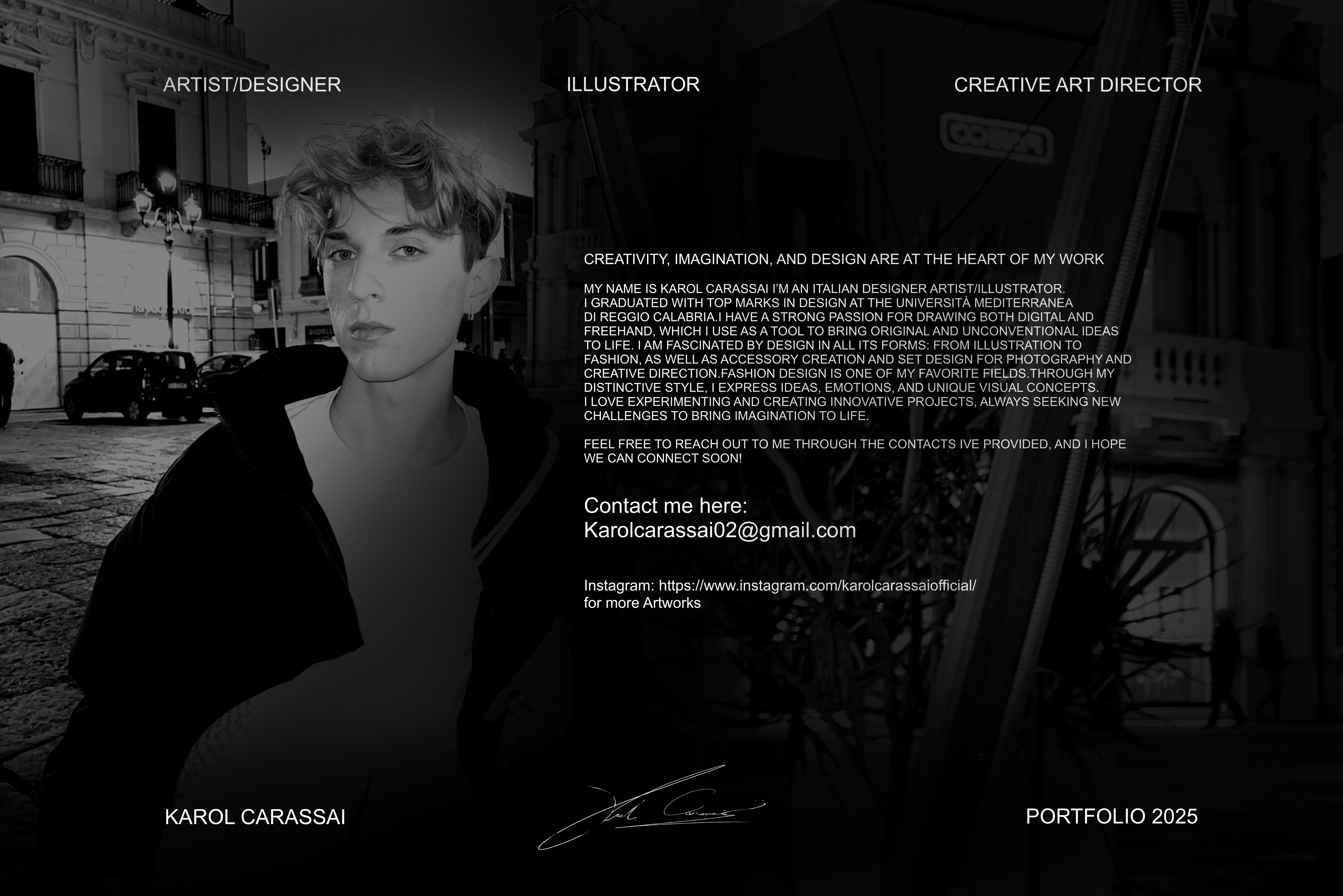Hi, I’m Karol Carassai, 22 years old, from Italy. Ever since I was a child, I’ve been in love with drawing and creating. I used to sketch outfits from cartoons, fascinated by every little detail. Over time, this passion grew into a calling: to become a fashion designer and build my own brand a brand of bold accessories, unique style, and playful strangeness that reflects who I truly am.