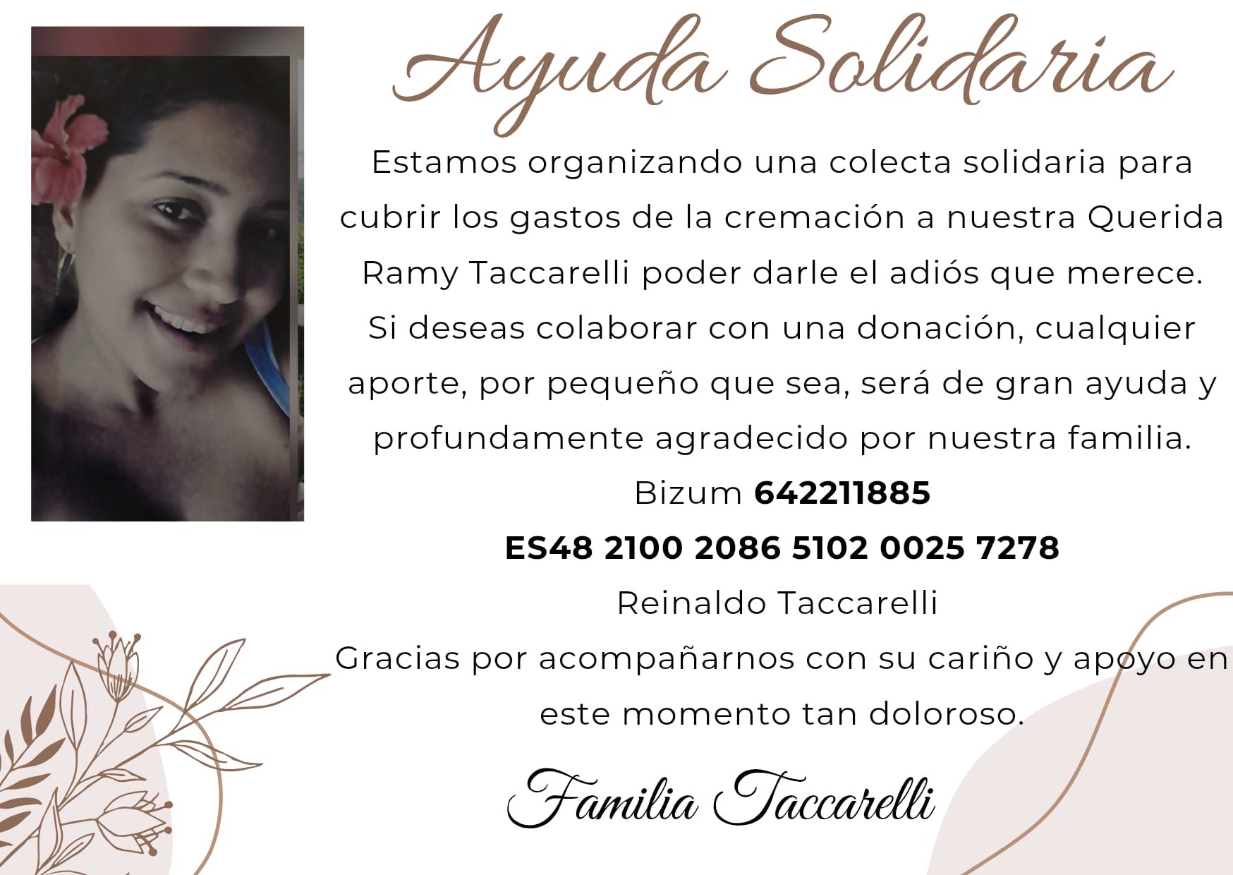 Nuestra familia ha sufrido una terrible tragedia. Una madre, una hija, una hermana, una mujer increíble, desapareció durante seis días en Guadalajara, España, antes de que la policía finalmente encontrara su cuerpo en una cueva. Nuestra querida Ramy Virginia Taccarelli fue asesinada por su expareja a los 41 años, dejando a una niña de cinco años y a un joven de dieciocho sin madre. Algunos familiares han viajado a España para ayudar a los niños, completar los trámites y colaborar con la prensa para concienciar sobre la gravedad de la violencia de género. Estamos creando esta campaña para recaudar fondos para darle a esta increíble mujer, la hermosa y dulce Ramy, la despedida que ella y mis primos merecen. Utilizaremos estos fondos para la cremación y los gastos legales. Cualquier contribución es muy valiosa y se agradece enormemente. Muchas gracias.
