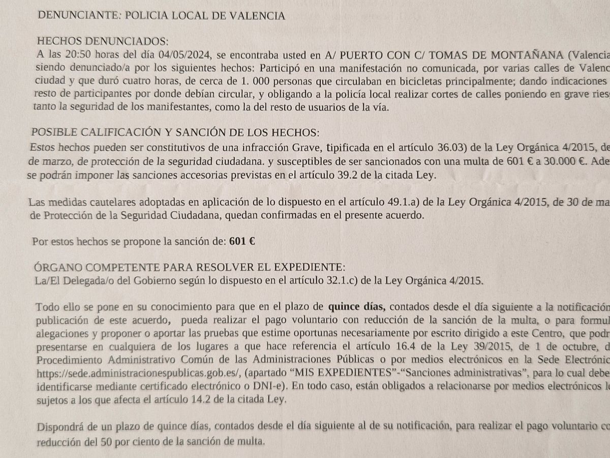 Repressió al moviment ciclista, a la lliure circulació dels ciclistes i una denúncia sense cap fonament ni prova. Darrere d'aquesta amenaça en forma de denúncia hi ha una estratègia clara de revertir tots els avanços en matèria de mobilitat a la ciutat de València i de reprimir les veus dissidents judicialitzant als moviments socials.