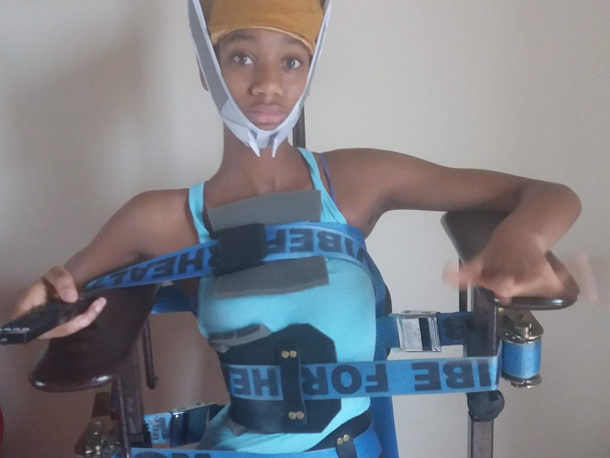 Hi, my name is Anaya Jones. I am 15 years old. I love taking selfies, riding bikes, playing at the park, singing, hanging with my family, watching tick-tock, and dancing. Up until a few years ago I could do all of those things at any given moment, but now my time to have fun is limited. I have severe Scoliosis, a sideways curvature of the spine. Since I was 12 years old I have had non-surgical treatments in Pennsylvania, Missouri, and Florida. These treatments consist of morning and afternoon sessions in a clinic working with a variety of machines and equipment to reduce spinal curves. Most would hop on a plane, but with over 100 pounds of equipment for a two week stay we choose to drive anywhere between 127 and 1,185 miles for treatment. I went from 5'2" to 5'8" in a matter of two years and my spinal curve grew from 32 degrees to 73 degrees. (For reference, a normal spinal curvature should not exceed 10 degrees) During treatment, my curve was able to get as low as 56 degrees. Although this correction is not stable, it does show the potential that I have for decreasing my curve. Last October, I began wearing a Scolibrace, an over-corrective brace that helps to guide my body and spine into a posture that is opposite of my scoliosis curve. My spine not only curves, it rotates, and without treatment, my rib cage will press into my lungs making it difficult to breathe.