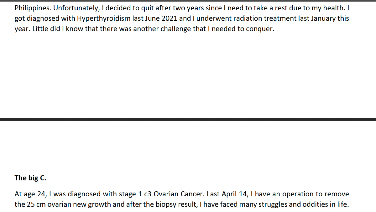 I caught up with her last week, and was devastated to find out that she was diagnosed with stage-1 ovarian cancer in April of this year. She had a 25cm (10 inch) tumor taken out and is now going through chemotherapy. I was especially heartbroken to hear that she had to quit her job. She had been saving money and was applying for post-graduate programs abroad, hoping for a bigger and brighter future for herself. Diana was accepted to a program in Canada but had to give up her spot due to her health issues. She is burning through her savings to pay for her medical and living expenses and will now need to find a part-time job just to survive.