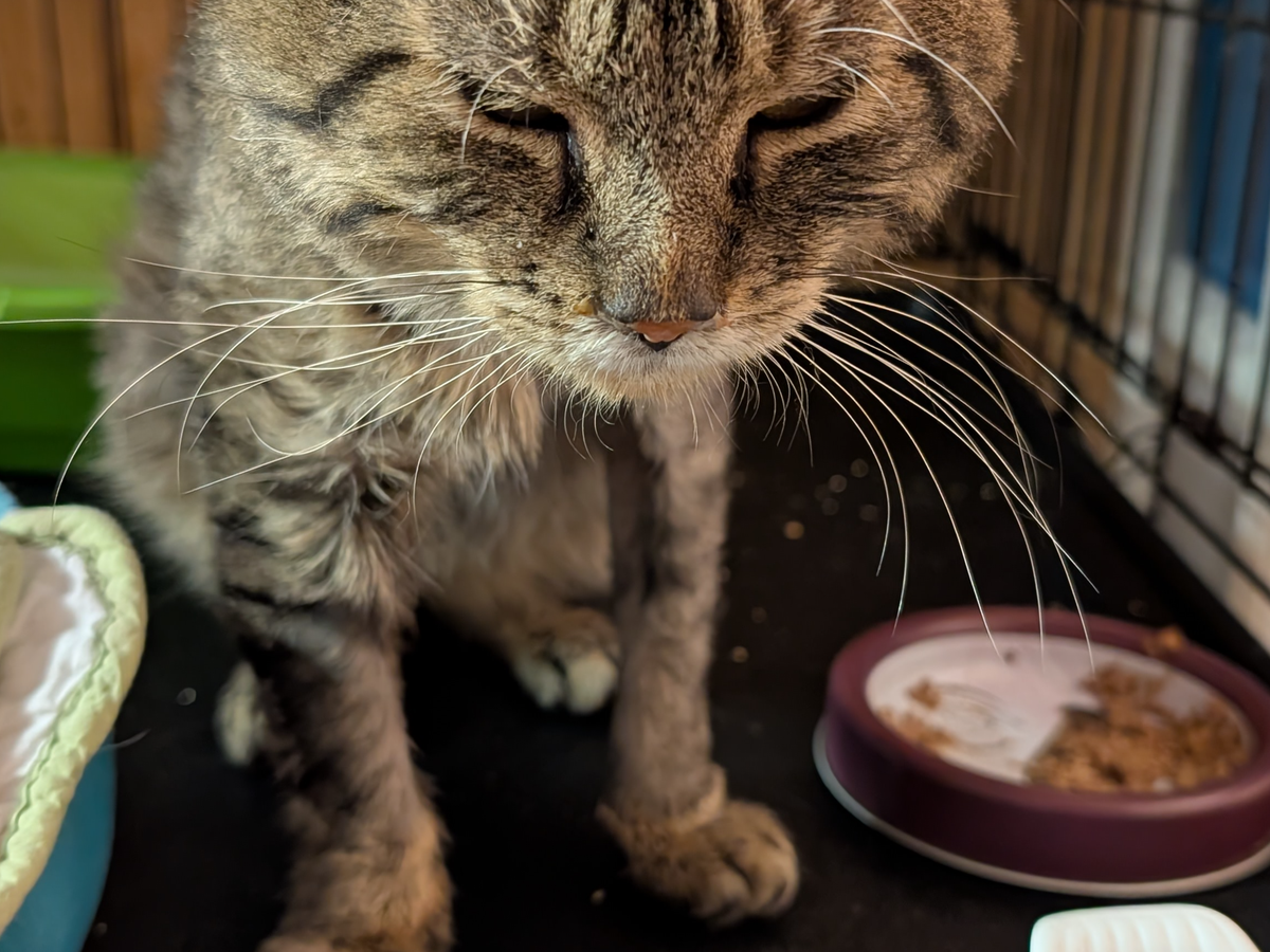 J’étais un chat errant et mal en point quand ma bienfaitrice NANIE m’a pris sous son aile pour me sortir des rues d’Acton Vale et me soigner en décembre dernier. Je souffrais de déshydratation, j’étais congestionné, anémique et fiévreux. J’ai été hospitalisé plusieurs jours. Mes tests sanguins ont révélé que j’avais probablement la PIF, une maladie virale grave.