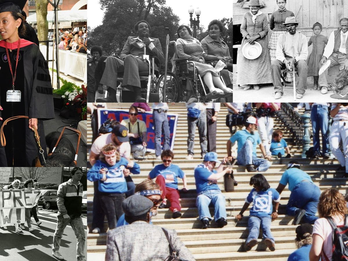 (Image: photo montage of disability history events - Haben Girma, first deafblind graduate of Harvard Law School; Brad Lomax and Judy Heumann at the 504 protest in front of the White House; Harriet Tubman with her family; march for Deaf President Now; Capitol Crawl to pass the ADA.)