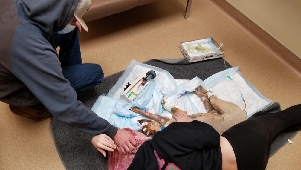 Dixie’s still in critical condition, her kidneys are in failure right now and her levels aren’t decreasing, they are worried about the third degree burns turning into an infection and causing it to go to her blood stream. We do have the option to put her on dialysis to see if that will help improve her kidneys, unfortunately the cost is very substantial and something we can’t afford. We decided to have them give her a surgically placed feeding tube in her stomach and that could potentially help with kidneys by getting food into her. If she does make it through all of this Dixie will loose both ears, her eye lids will need surgery/ reconstruction and if the surgery doesn’t go well they might have to remove both eyes. If the skin under the third degree burns on her abdomen isn’t good skin they will have to do a skin graft. ♥️