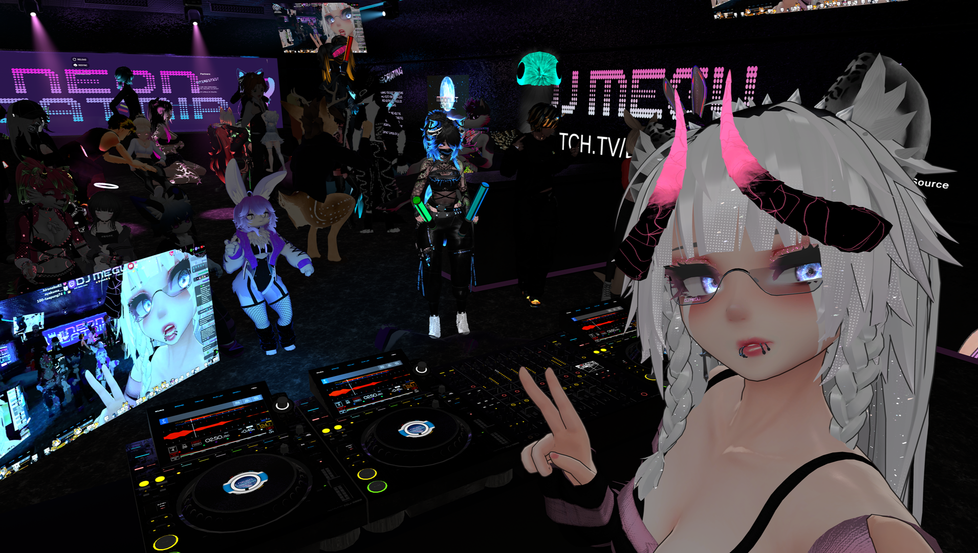I am DJ Megu, or Megu to most people. I am a Virtual DJ in a platform called VRChat, I also create worlds in VRChat for people to use such as Quiet Comforts for hanging out and watching videos together, also Neon Catnip and Moonlit Chill for DJ Events. On the side of my main DJ Content I also do Virtual Photography and VTubing Live Gaming Streams.