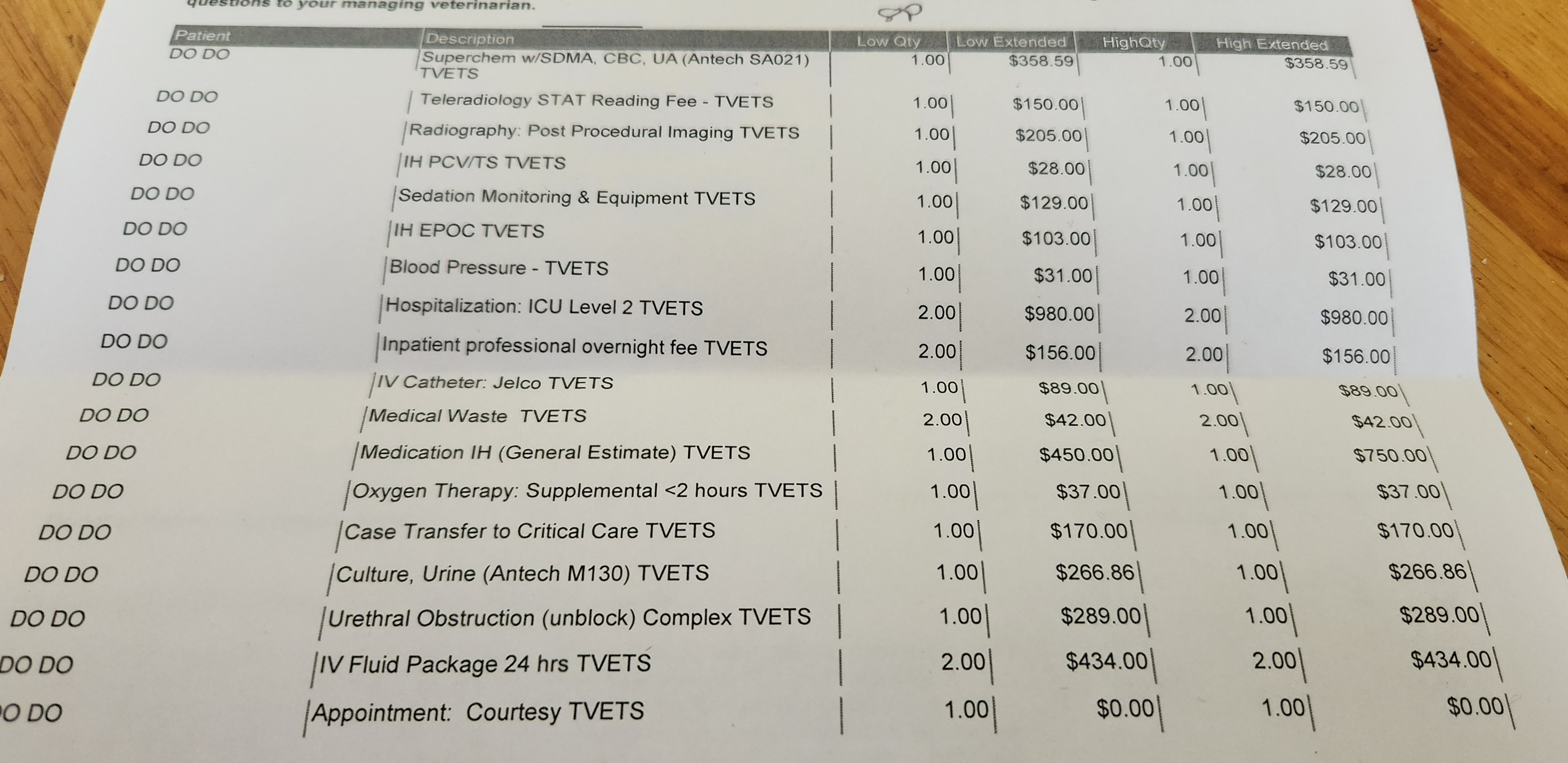 The estimated cost for Dodo's treatment and hospitalization is high/low: $4,265.33/$3,946.47.