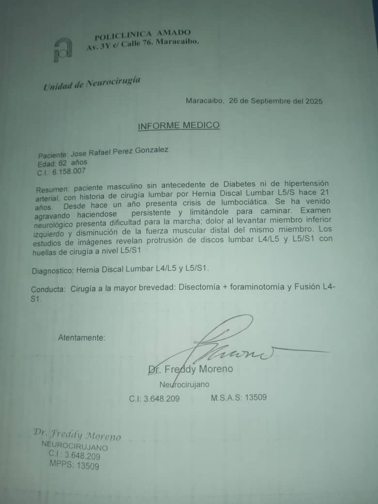 Es un placer saludarte, mi nombre es José Rafael Perez venezolano de 62 años de edad. Mucho sabré agradecer que hagas un alto en tu día a día para conocer mi situación, me encuentro impedido para movilizarse por una protusion de disco lumbar L4/L5 y L/5-S1.