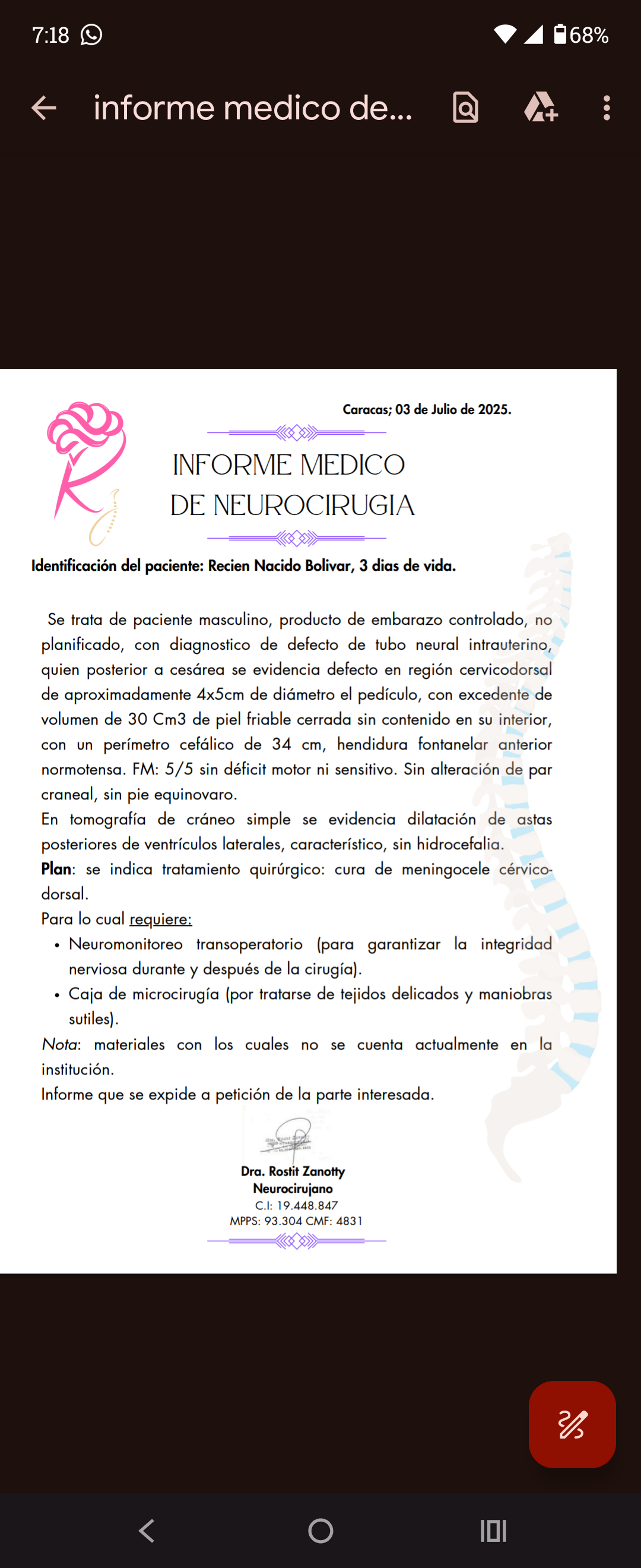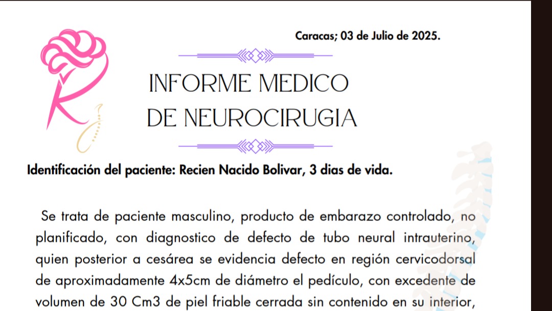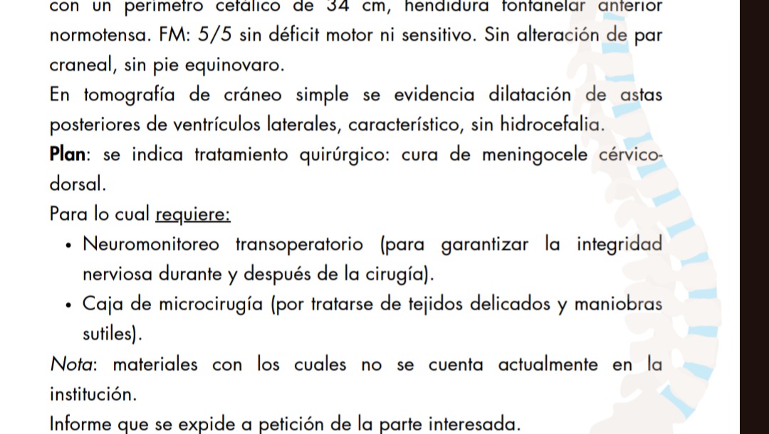 Hello, my name is Blanca Cortez. I am raising funds for Josue Israel, a newborn baby boy. This is a male patient, the product of a controlled, unplanned pregnancy, diagnosed with an intrauterine neural tube defect. After a cesarean section, a defect was found in the cervicodorsal region, measuring approximately 4x5 cm in diameter at the pedicle, with an excess volume of 30 cm3 of closed, friable skin with no contents inside. Head circumference: 34 cm, anterior fontanelle fissure, normotensive. FM: 5/5 with no motor or sensory deficits. No cranial nerve alterations, no clubfoot. A simple cranial CT scan shows characteristic dilation of the posterior horns of the lateral ventricles, without hydrocephalus. Plan: Surgical treatment indicated: treatment of cervicodorsal meningocele. This requires: Intraoperative neuromonitoring (to ensure nerve integrity during and after surgery). Microsurgery kit (due to the delicate tissues and subtle maneuvers). Note: Materials not currently available at the institution. Report issued at the request of the interested party.