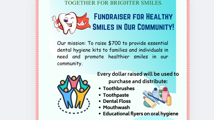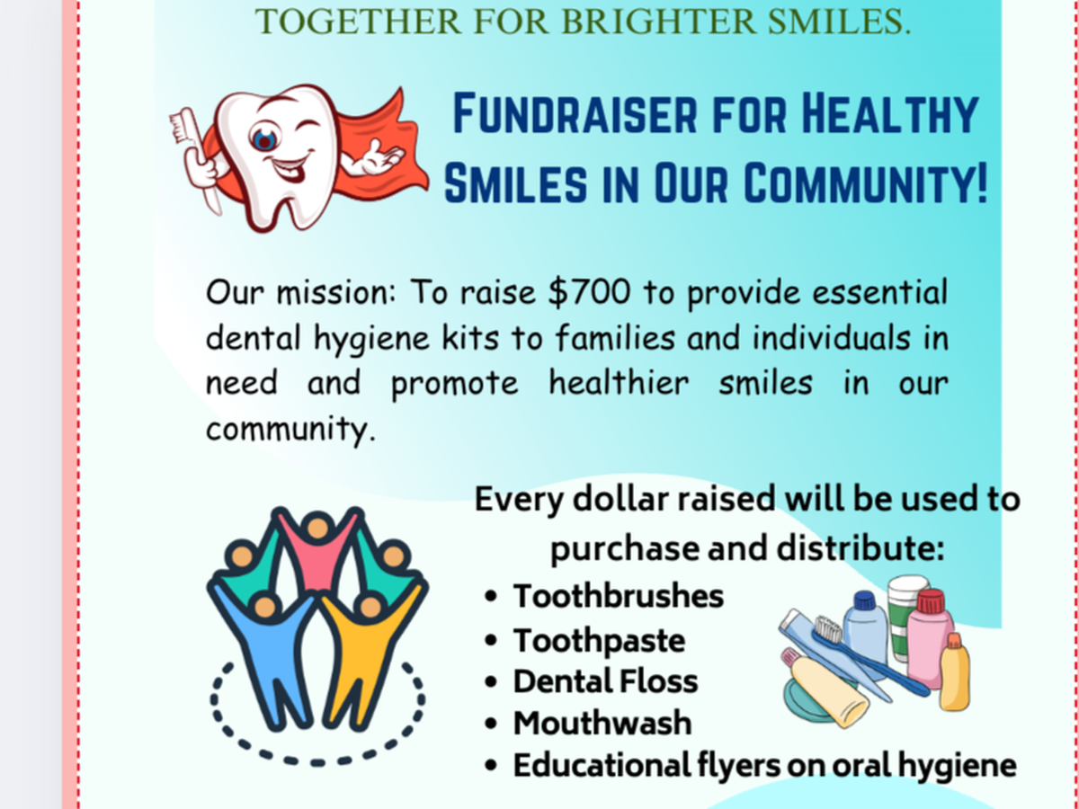 Our goal is to raise $700 to buy and donate dental hygiene supplies—including toothbrushes, toothpaste, floss, and mouthwash—to people in need. We’ll be delivering these items to local schools, churches, shelters, homeless communities, and family centers so that everyone has the chance to care for their teeth and maintain good oral health.