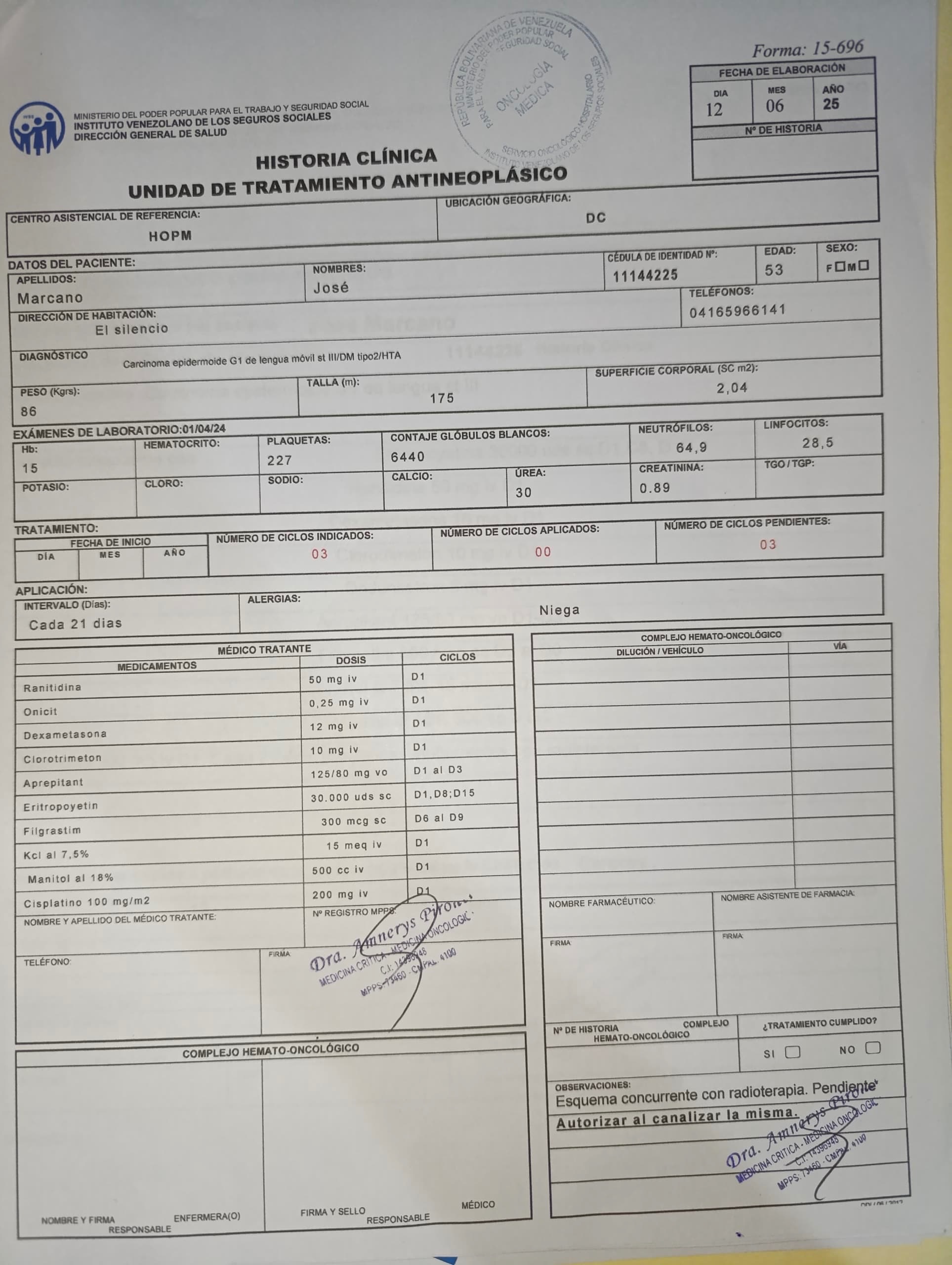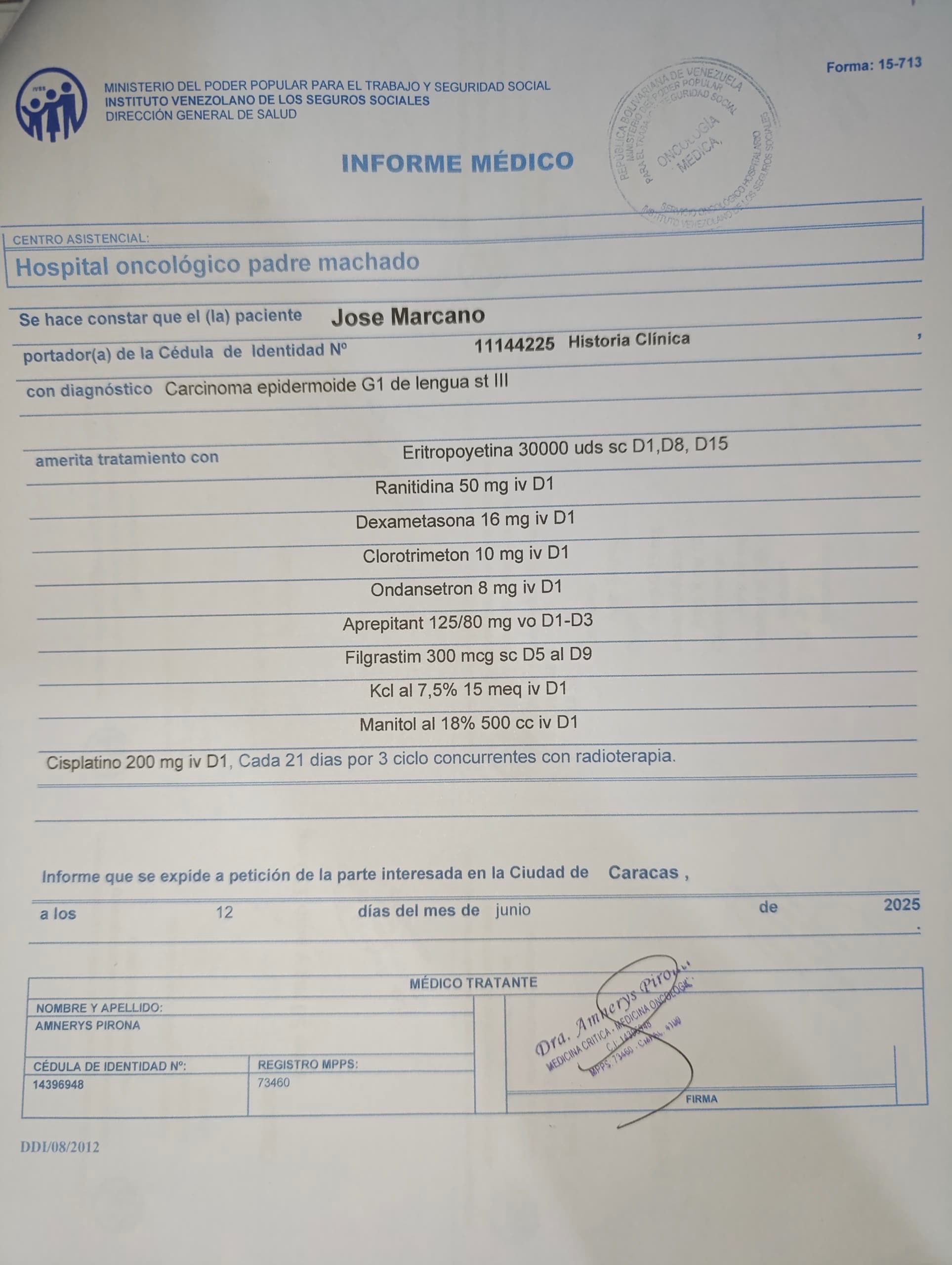 Yo, José Marcano, titular de la cédula de identidad número 11.144. 225, Venezolano y residenciado en la Isla de Margarita, Estado Nueva Esparta, Venezuela, desde el mes de febrero, acudí a una consulta médica con un doctor oncólogo, quien me recomendó realizarme una biopsia en la hemilengua derecha.