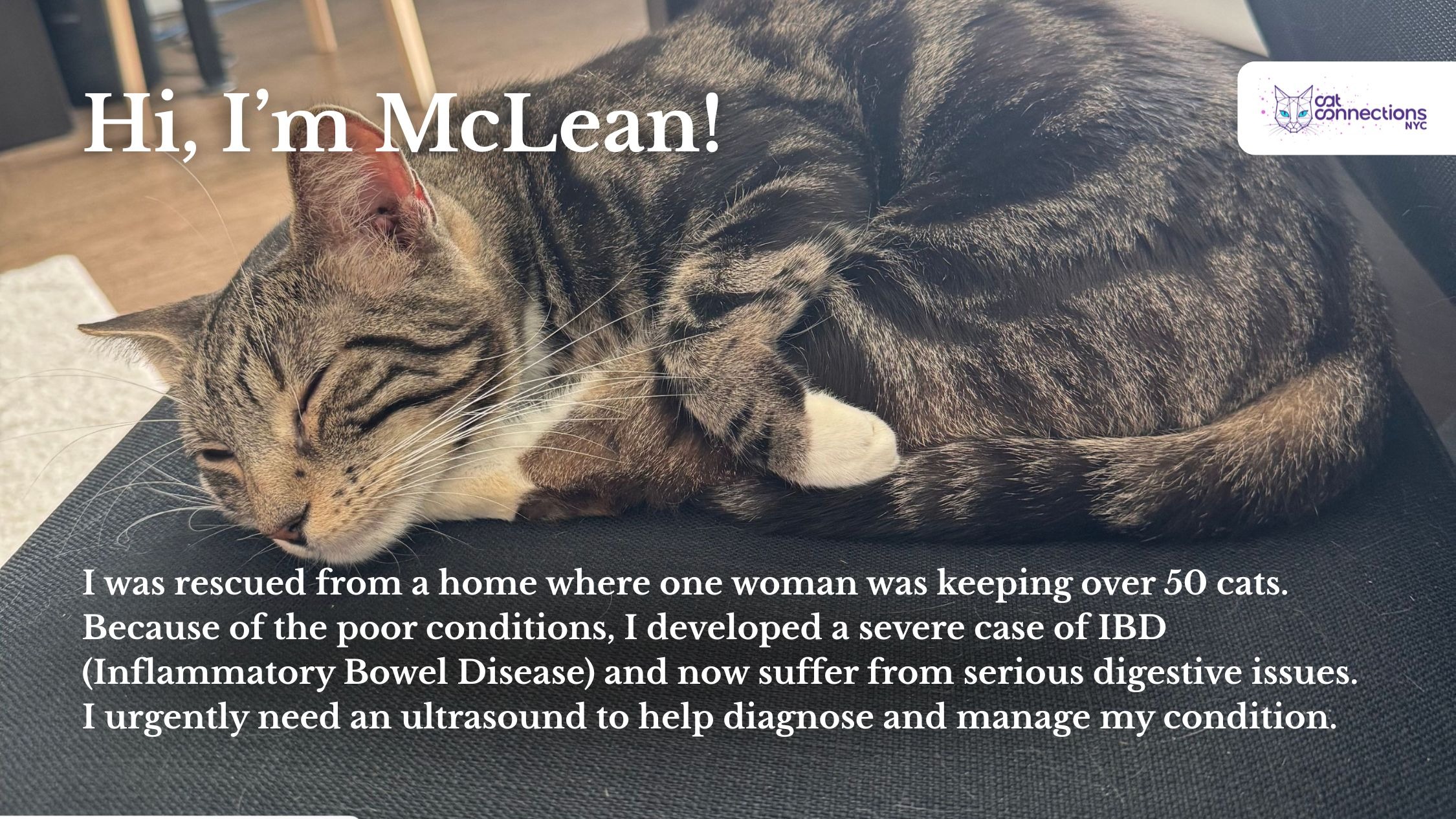 Since his rescue, McLean has been struggling with a severe case of IBD (Inflammatory Bowel Disease). He suffers from chronic digestive issues - frequent discomfort, difficulty eating, and distressing symptoms that leave him weak and in pain.