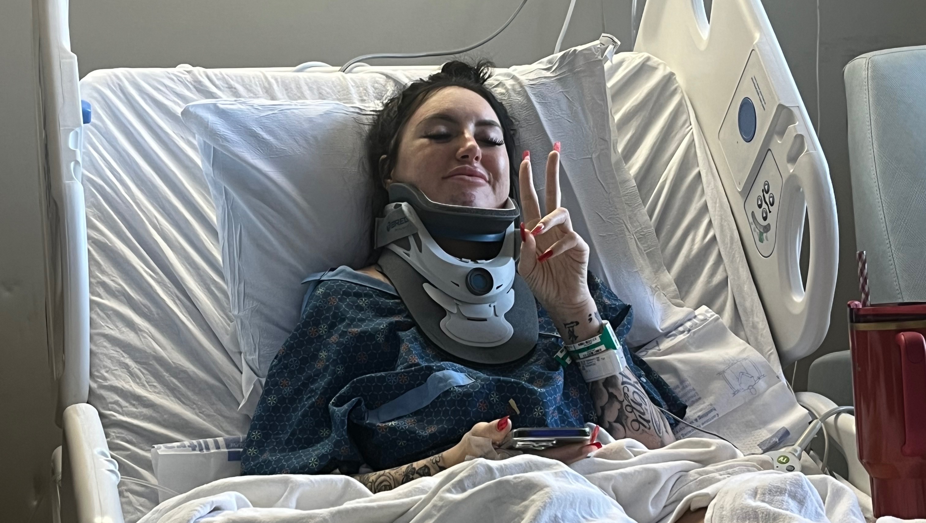 I suffered nine broken vertebrae in my spine, one broken vertebrae in my neck, a broken shoulder, a broken collarbone, eight broken ribs, five on my right side, and three on my left side, a fracture in my skull on the right side, a small fracture in my right hip, a torn esophagus, bruised, lungs, I almost bit my tongue off completely. It’s been very painful. I’m still in the hospital until probably January 2nd. But I’m very open minded and ready to be home and recover.