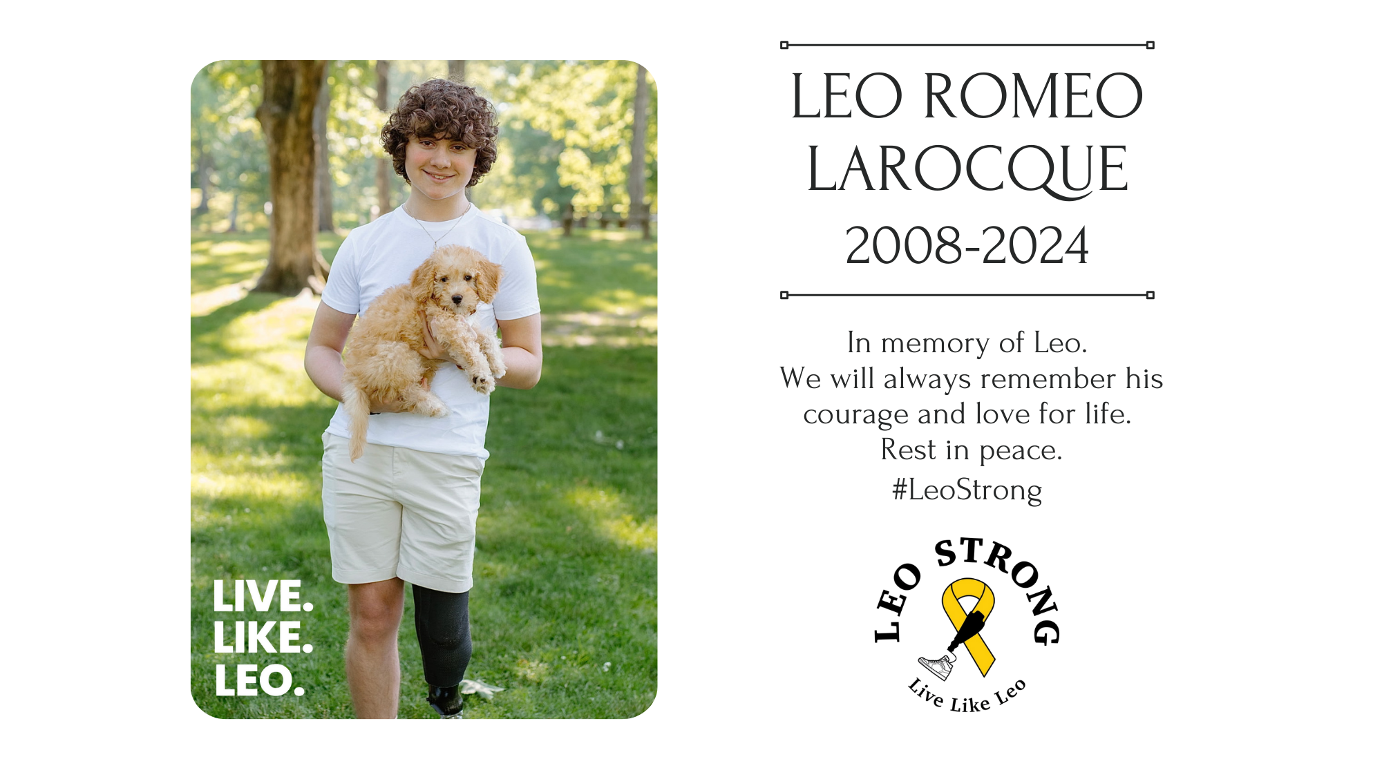 Leo passed away on December 20, 2024, just one day before his 16th birthday, after a long and difficult battle with Ewing’s sarcoma. Losing Leo has completely devastated and dismantled Leo, Heather, and Rylan’s world. Finding the strength to simply make it through each day has proven to be a heartbreaking and challenging task. On top of the financial strain of medical bills, and with Big Leo missing work for an extended period (the last 6 months of Leo’s life, and the time of grieving afterwards), the Larocque family is still trying to recover financially.