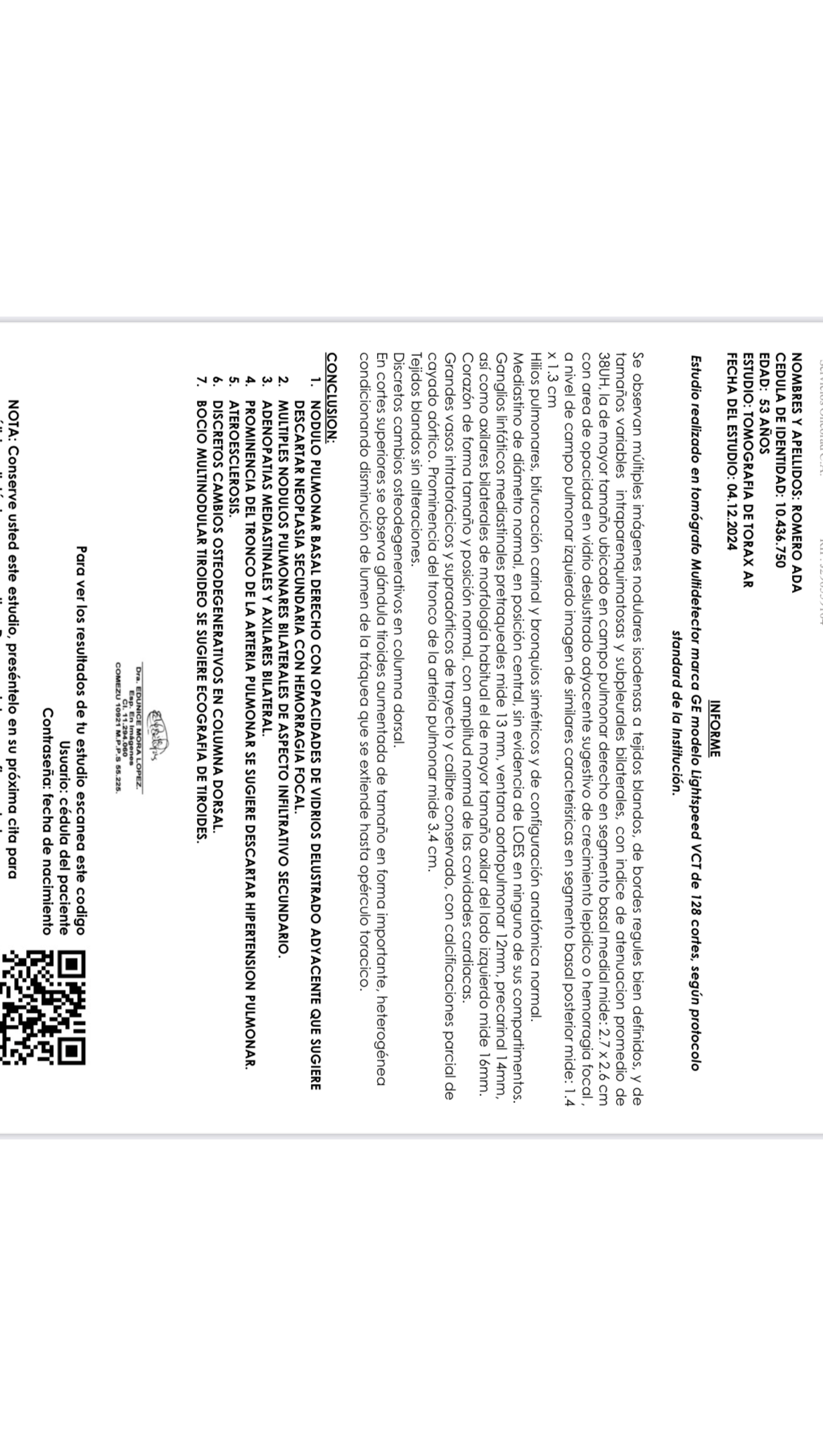 El viernes 12/06 se le hizo una tomografía de alta resolución que concluyó con múltiples nódulos de aspecto e infiltrativo, hipertensión arterial, entre otros.