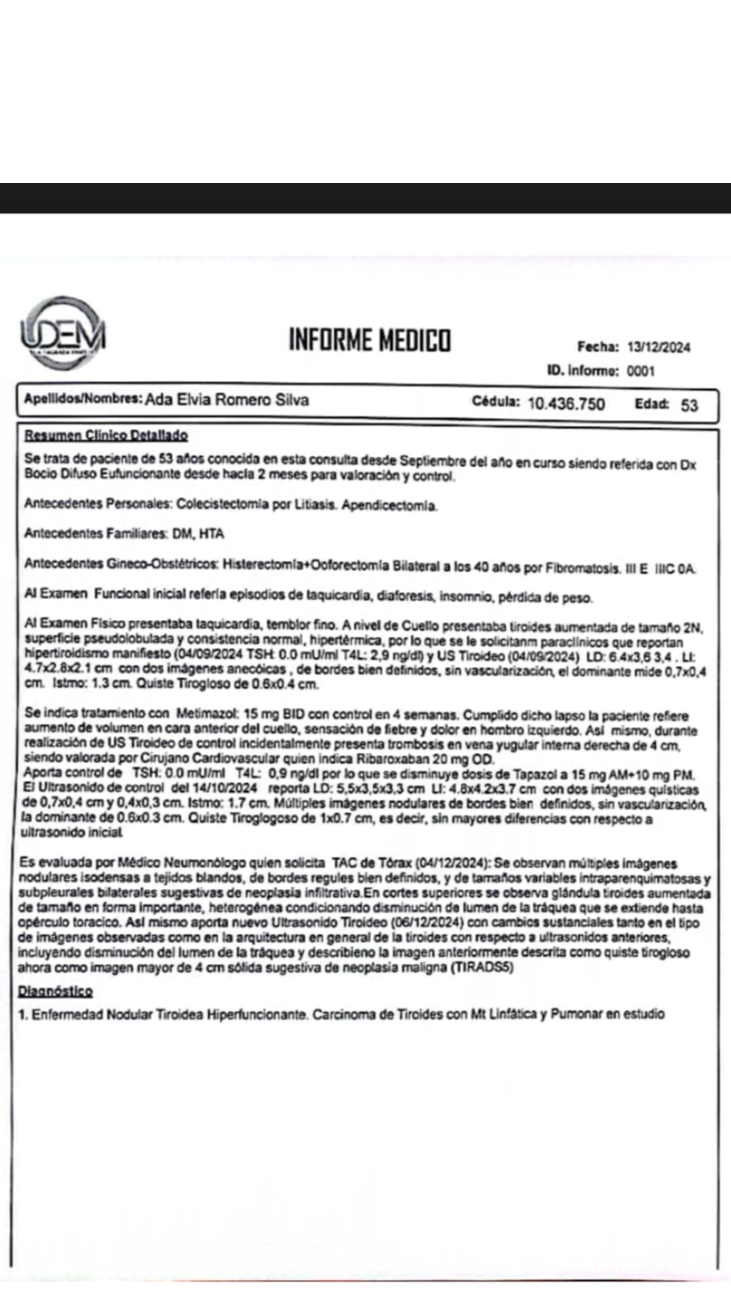 My mom, Ada Romero, who lives in Maracaibo, Venezuela was diagnosed with hyperthyroidism in August 2024. She started treatment right away, but in September, she developed a complication - a blood clot in the jugular vein. Since then, her health has deteriorated significantly. Today, November 30, 2024, she has developed aggressive pneumonia. The prescribed treatment is extremely costly, and given the precarious situation in Venezuelan hospitals, we've decided to start treatment at home.
