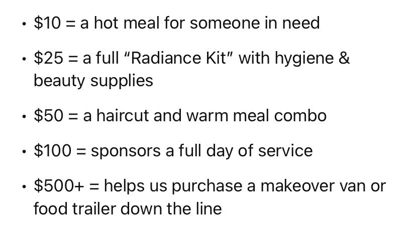 In time, we’ll expand into a fully outfitted food and makeover van, creating community pop-ups where people can eat, freshen up, and remember their worth.