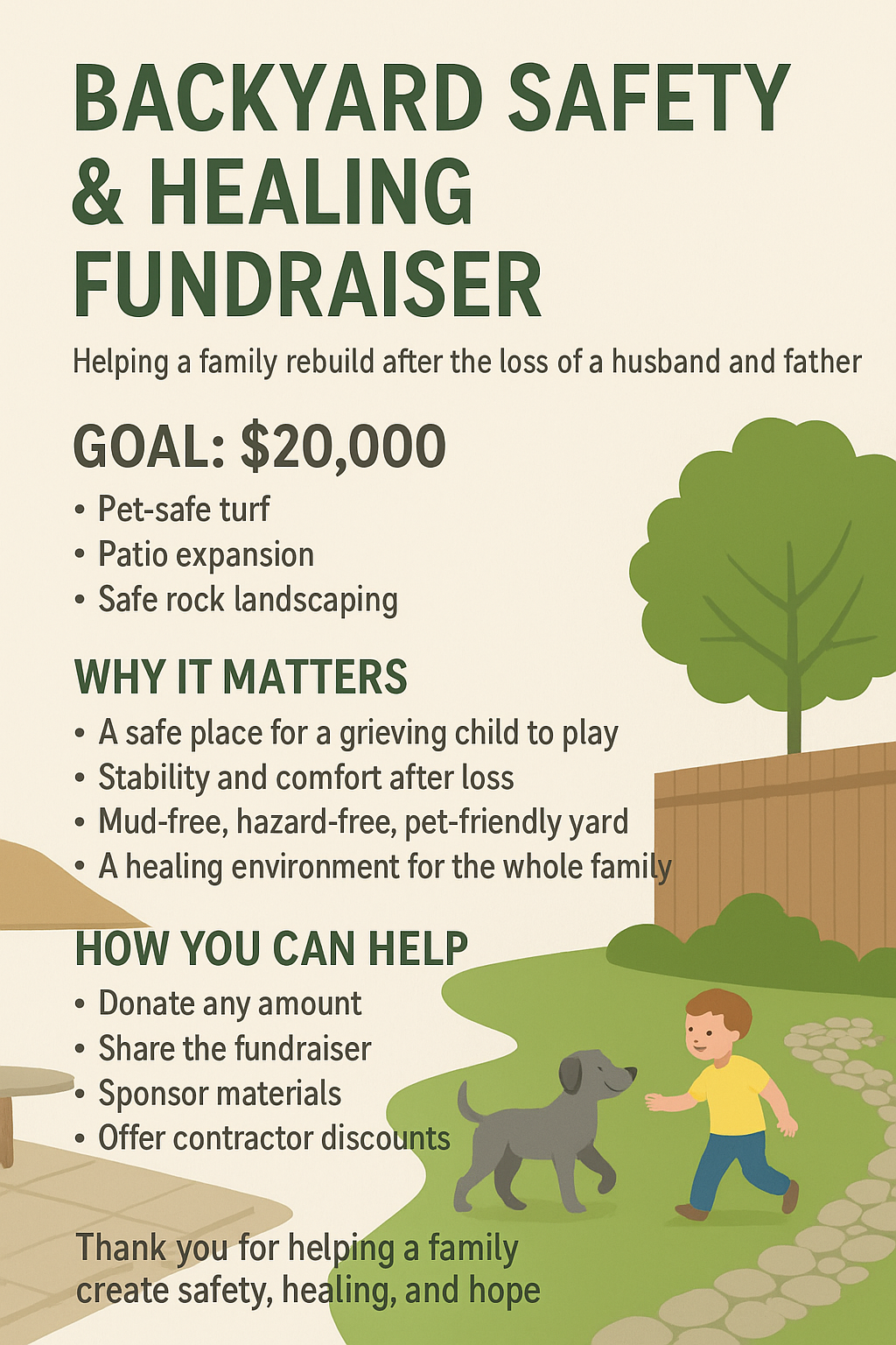 More than ever, we need a secure, peaceful space at home. A place where my son can play safely and freely… a place where our dogs can run without risk… a place that brings calm, routine, and healing to our new life.