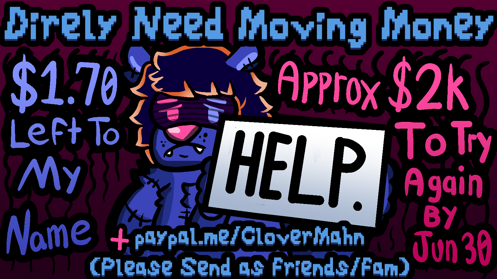 My name is Clover, a very small-time artist/creative/streamer, and I am raising funds in a plea for getting my life back together.