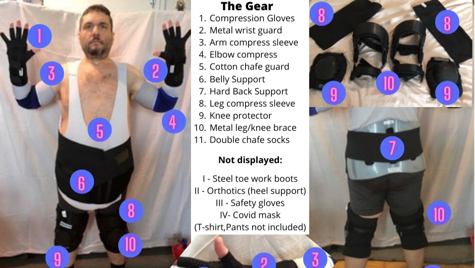 *I took a physical job to force me to get exercise as part of my obese recovery. This is the support gear I wore for the first year to combat my chronic pain. I still wear support gear, just not as much at this point.