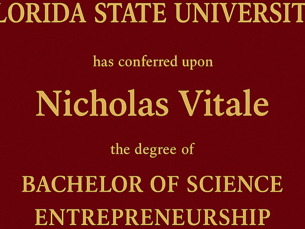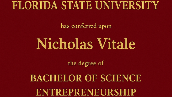 Nicholas had a tough road to graduation. He first started school in May of 2019, but, like many others, had to leave school during the COVID-19 pandemic. After taking a short break and receiving his A.A. Degree from Seminole State College, Nicholas bravely went back to FSU to graduate. He fought long and hard to get back into his college, get all of his credits, raise his GPA, and complete a tough internship. We are proud to announce that he has graduated from FSU with an overall GPA of over 3.0, with a Bachelor's Degree in Entrepreneurship in the Fall of 2025!