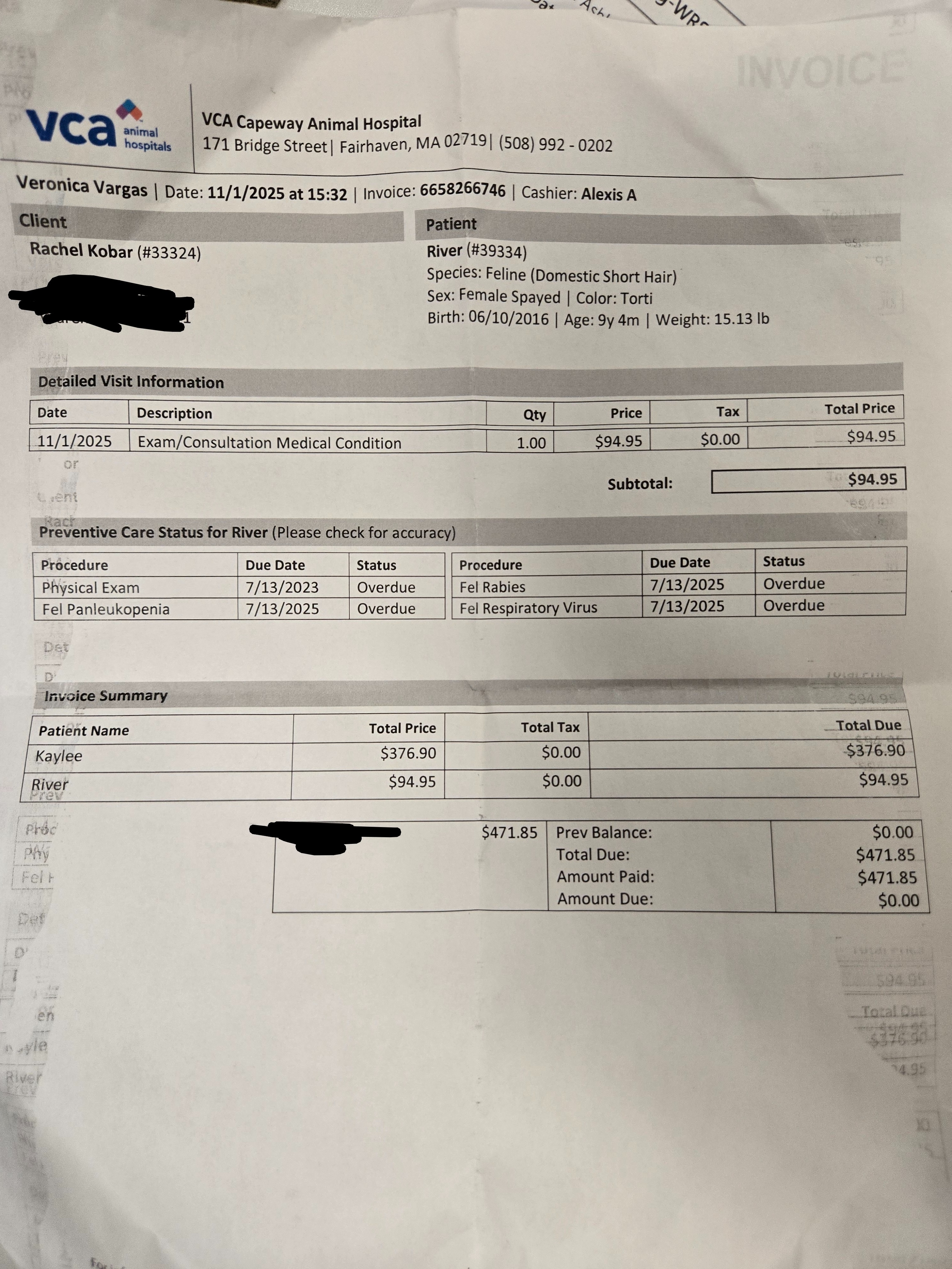 So, Kaylee had been losing weight and River has a small lump on her shoulder.