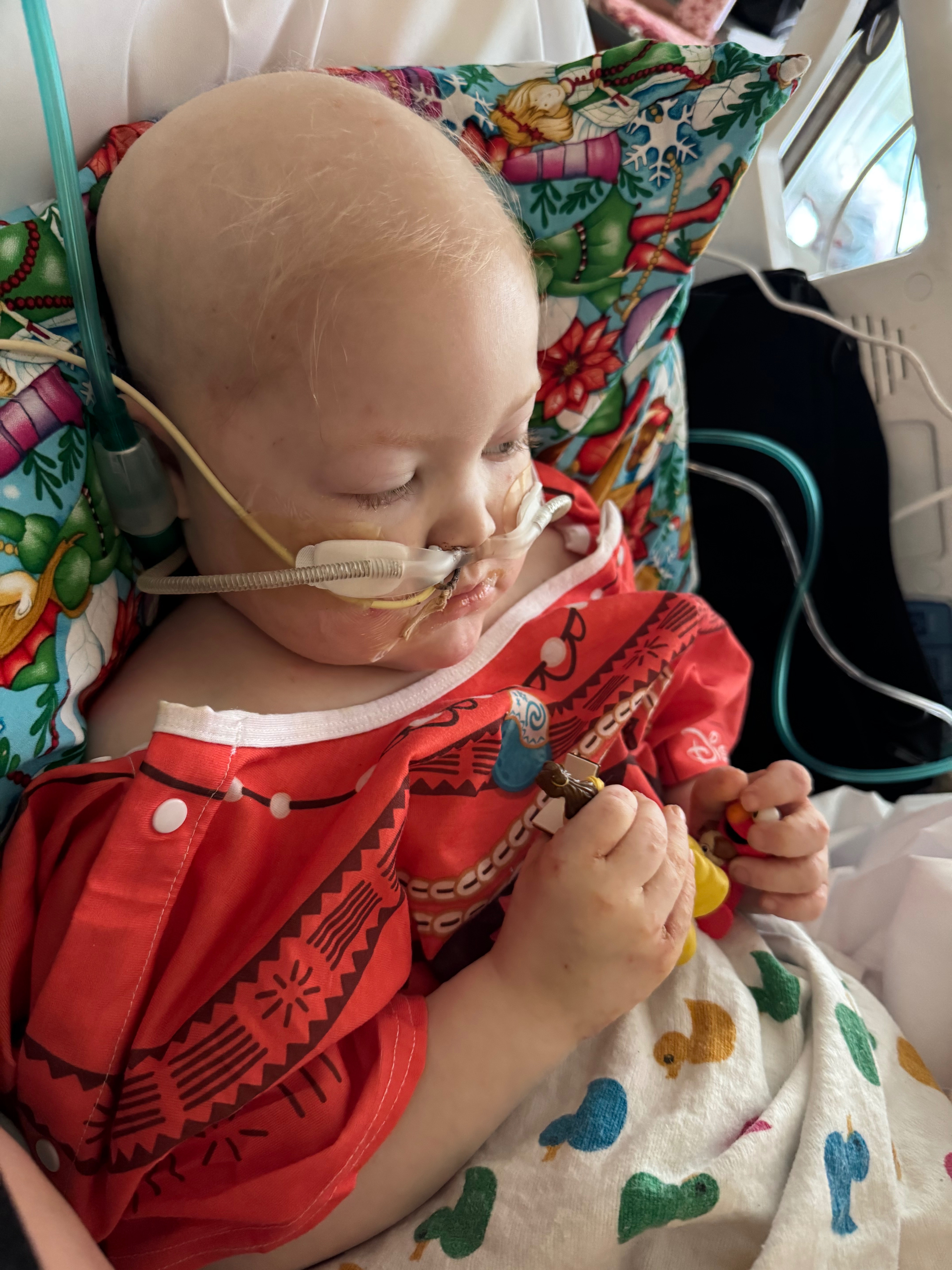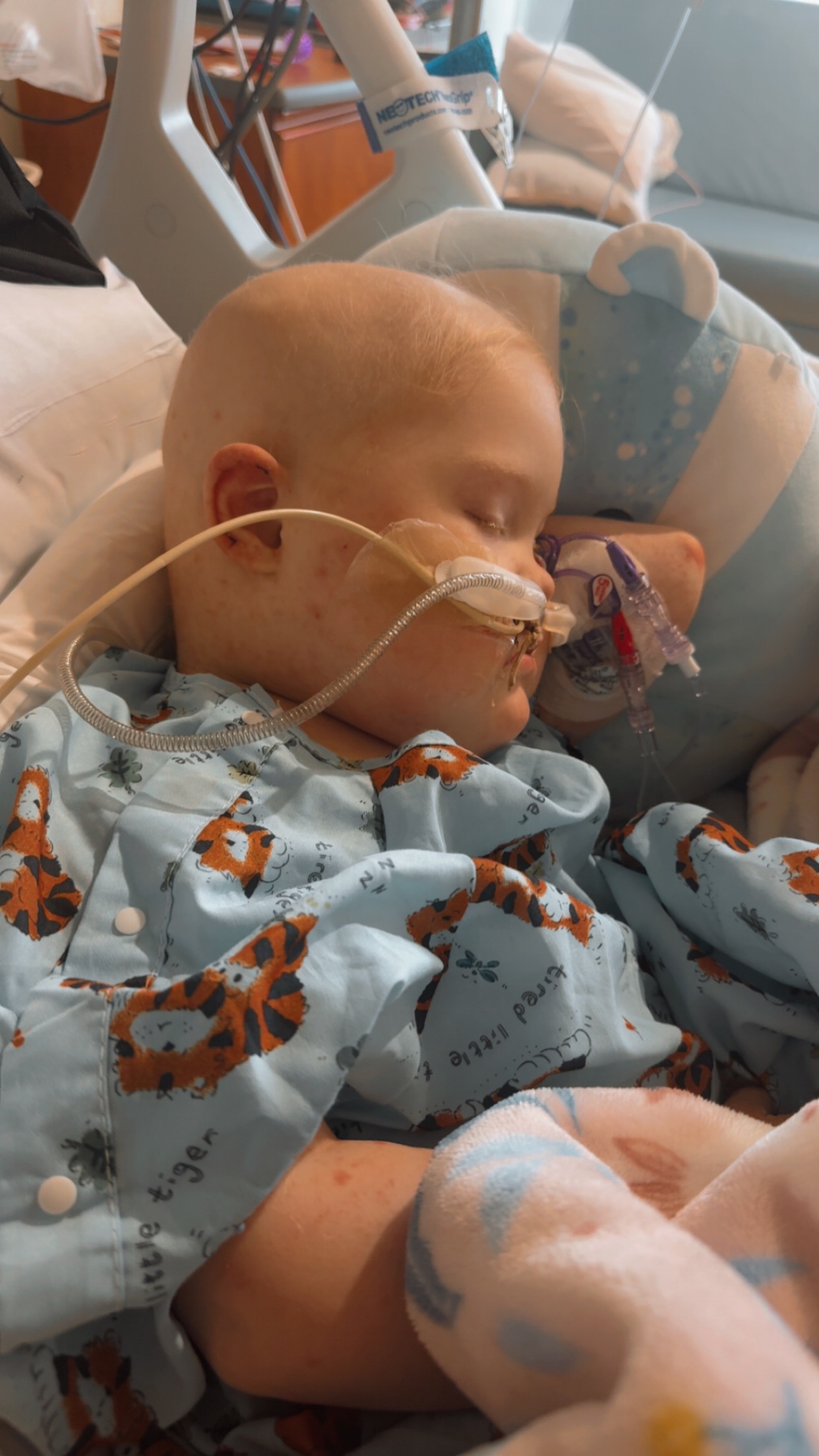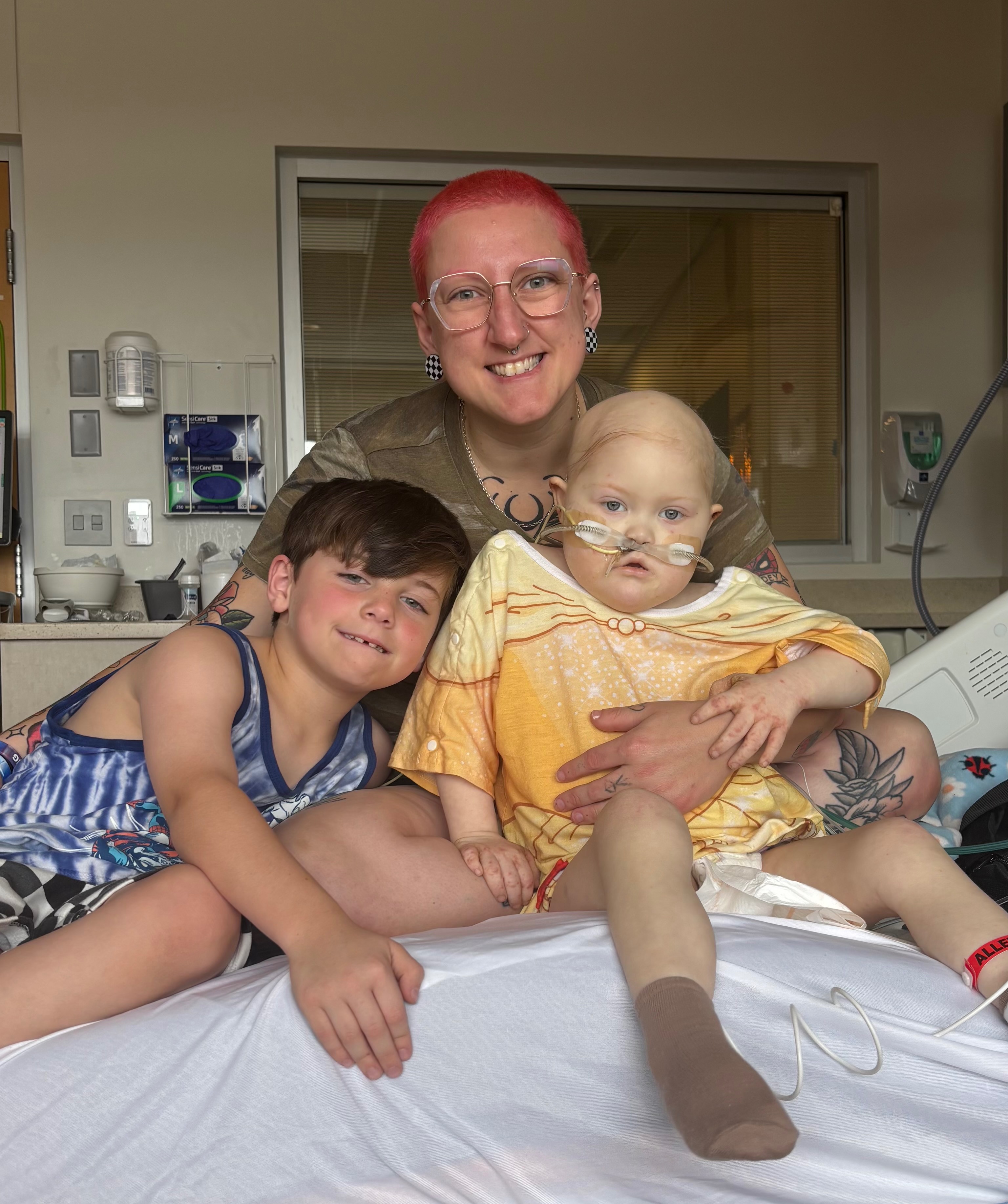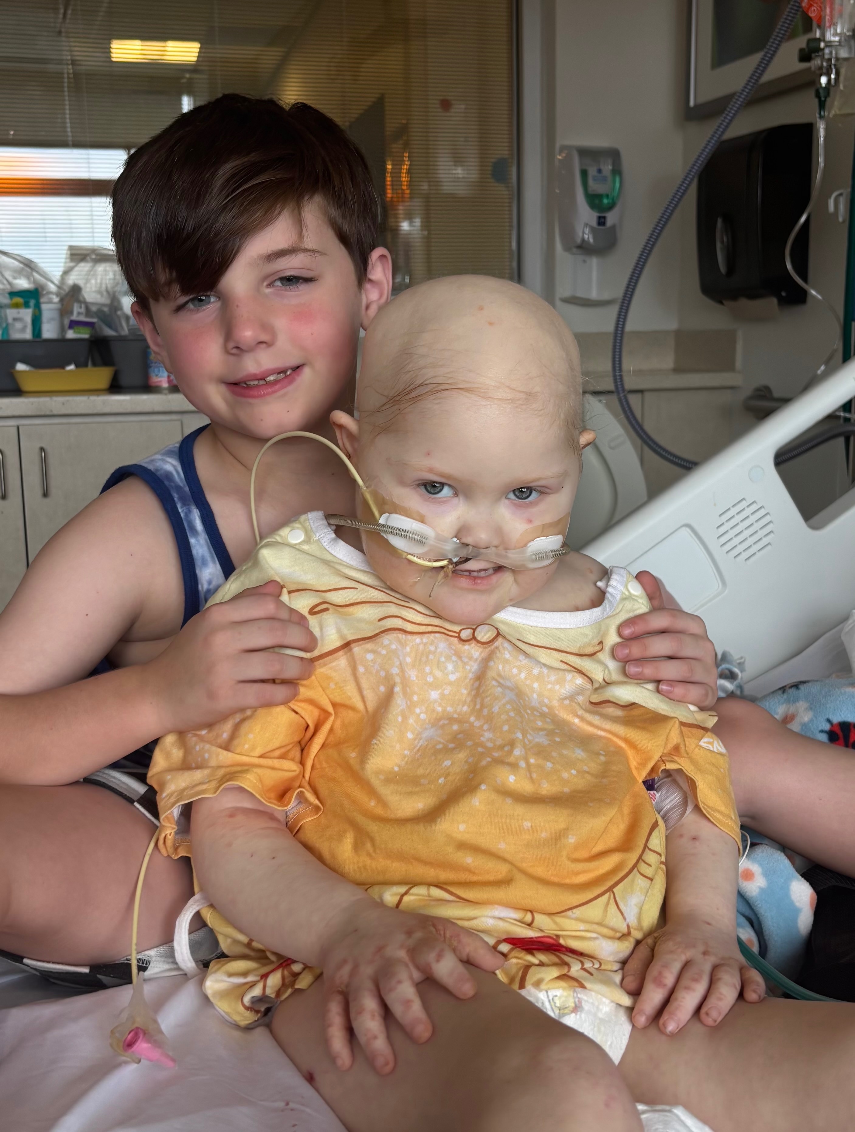 June 2025 Korras bone marrow came back showing she is in remission and has no cancer cells in her spinal cord and bone marrow. Shortly after the good news, I noticed sissy seemed to be in severe abdominal pain. Several tests and scans later it was determined Korra had developed a bacterial infection in her stomach which ate a hole in it. She was quickly rushed to emergency surgery and placed on meds to repair the hole and fight the infection. Korra experienced complications and was placed on a ventilator. After two days doctors attempted to remove the vent and it failed. Korra wasn’t breathing on her own enough and the vent was placed back in. After another seven days the vent was successfully removed. She now had an NG tube to receive what pediasure she wasn’t consuming on her own.